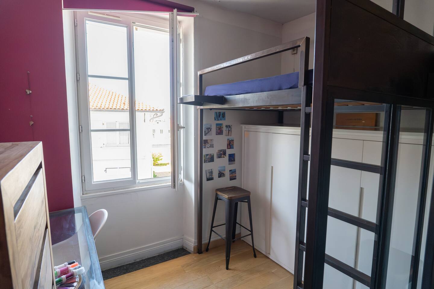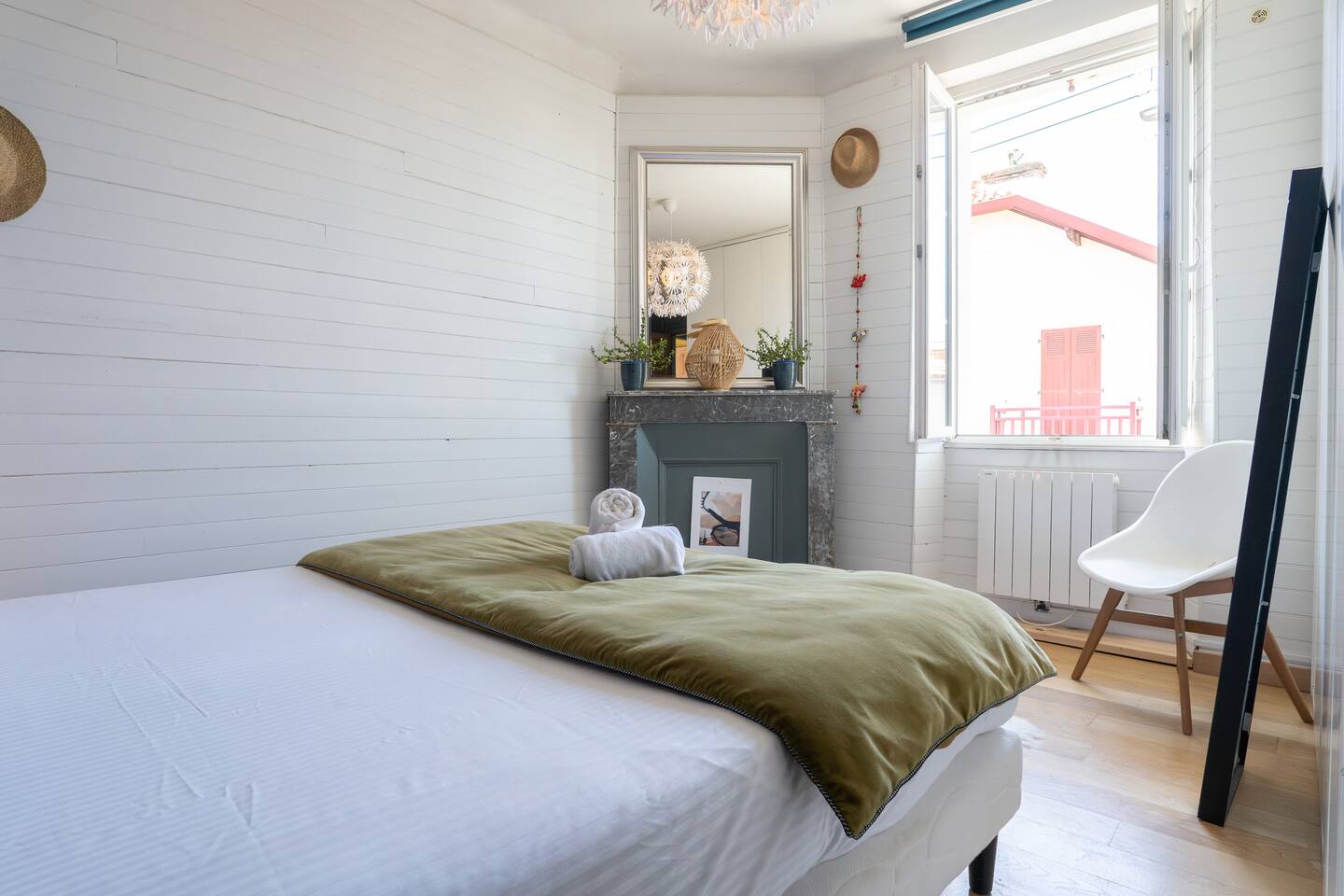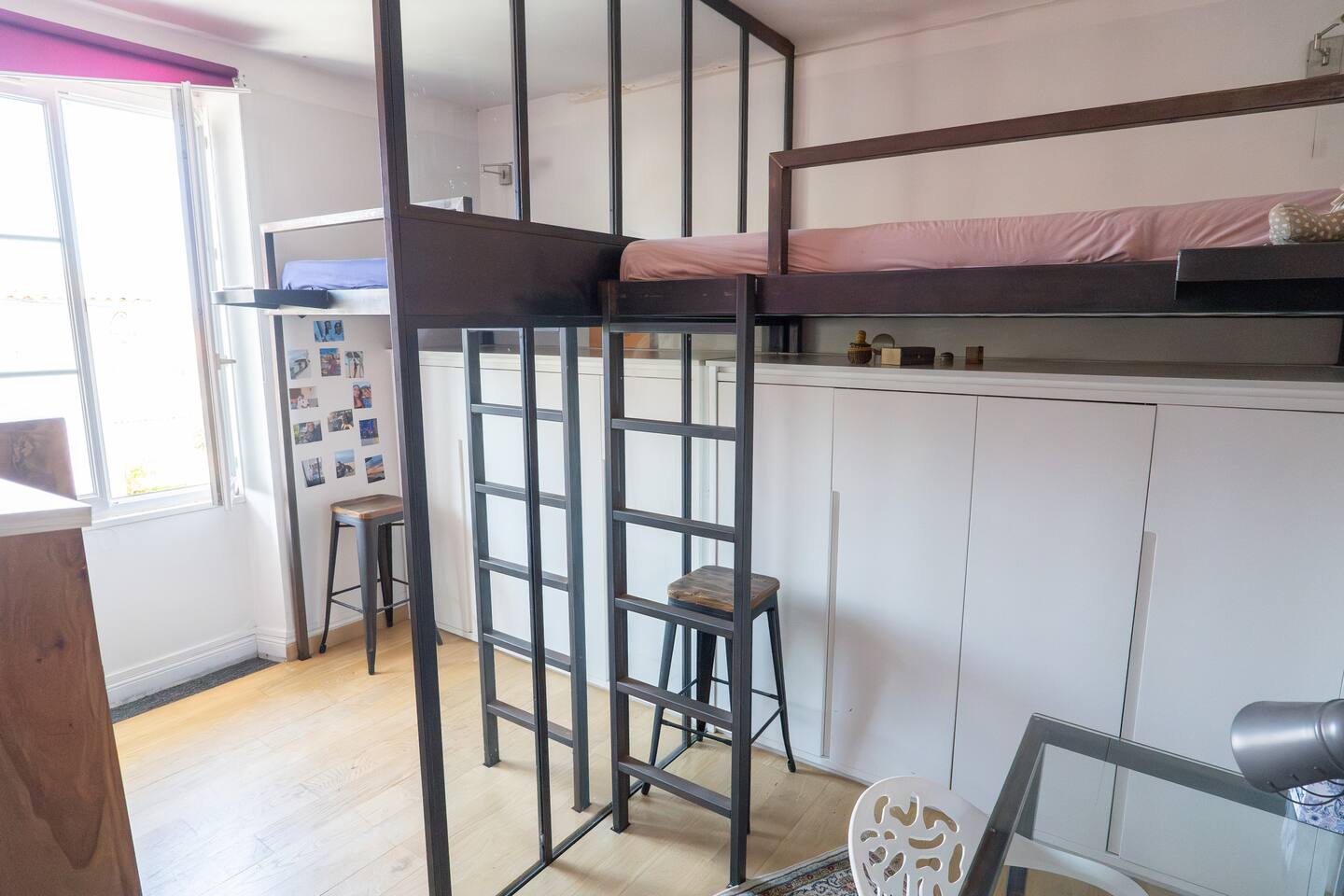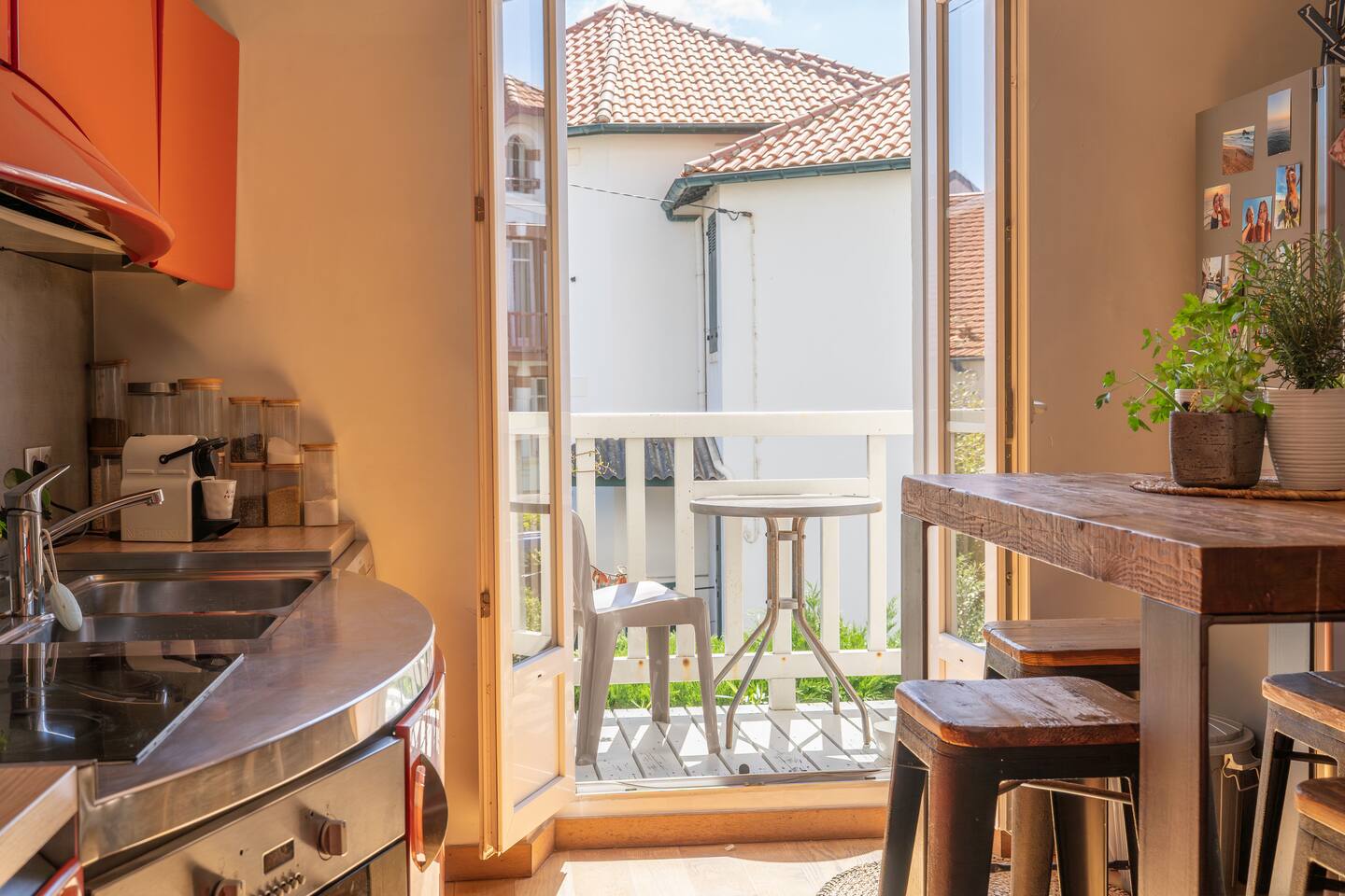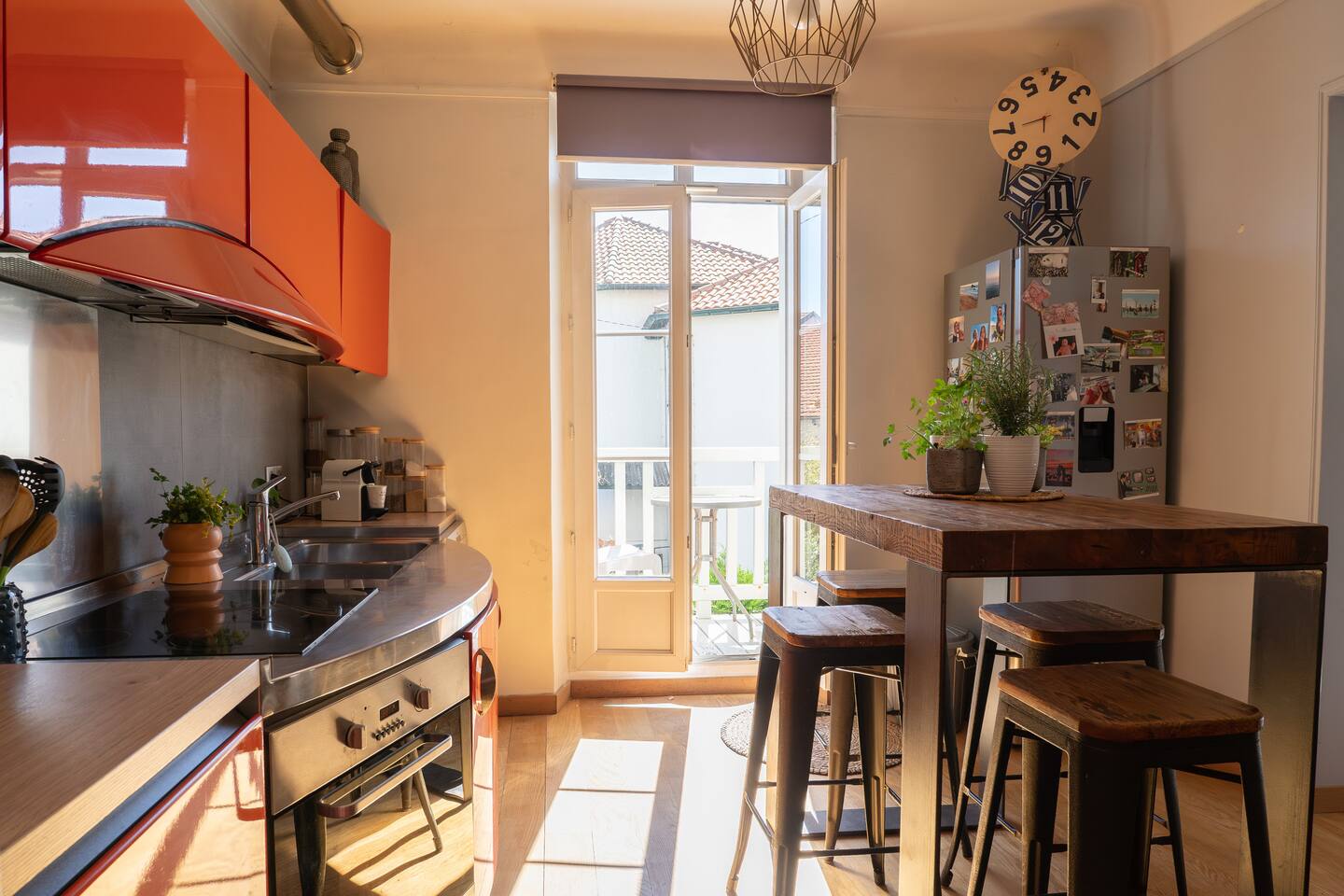 L’appartement est parfaitement agencé et s’organise le long d’un couloir ouvert dès l’entrée, offrant une belle circulation des espaces. La cuisine est entièrement ouverte : sur l’entrée, sur le salon, et sur un petit balcon exposé plein sud. Elle est équipée d’une plaque vitrocéramique, d’un four, d’un lave-vaisselle et d’un grand réfrigérateur. Une jolie table en bois ancien et parements de fer au centre, pour des repas conviviaux. A noter que la cuisine n'est pas équipée de micro-ondes ni de congélateur. Le salon, accessible à la fois depuis le couloir et la cuisine, propose de nombreuses assises avec un grand divan et s’ouvre sur un balcon filant le long de la façade. Au fond du couloir se trouvent les deux chambres exposées ouest, ainsi qu’une salle d’eau moderne, équipée d'un toilette, lavabo et d'une douche : Chambre 1 : lit double en 160 cm Chambre 2 : deux lits superposés en 120 cm, parfaits pour enfants ou amis