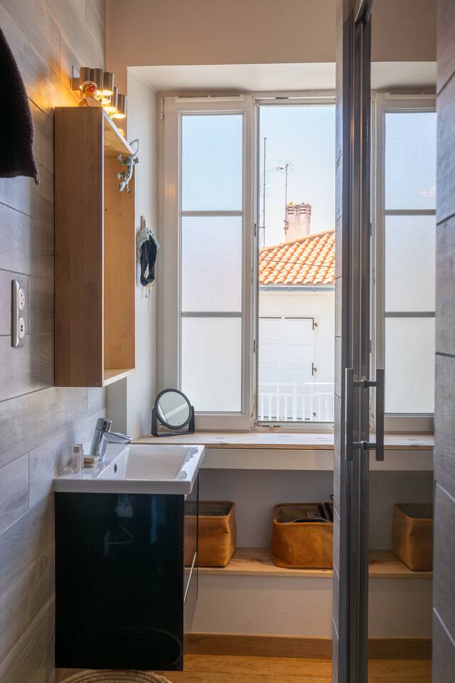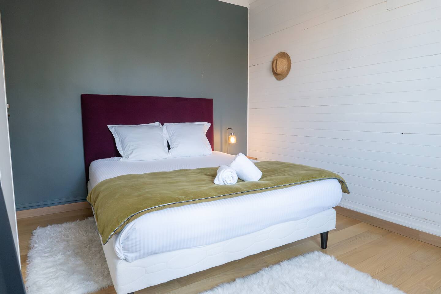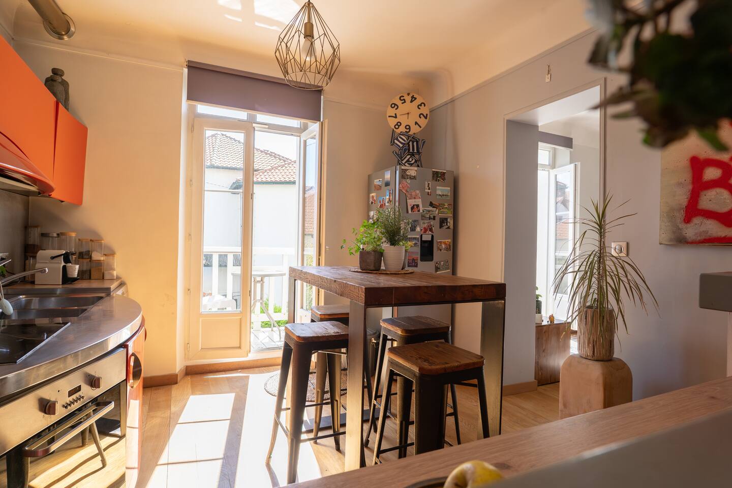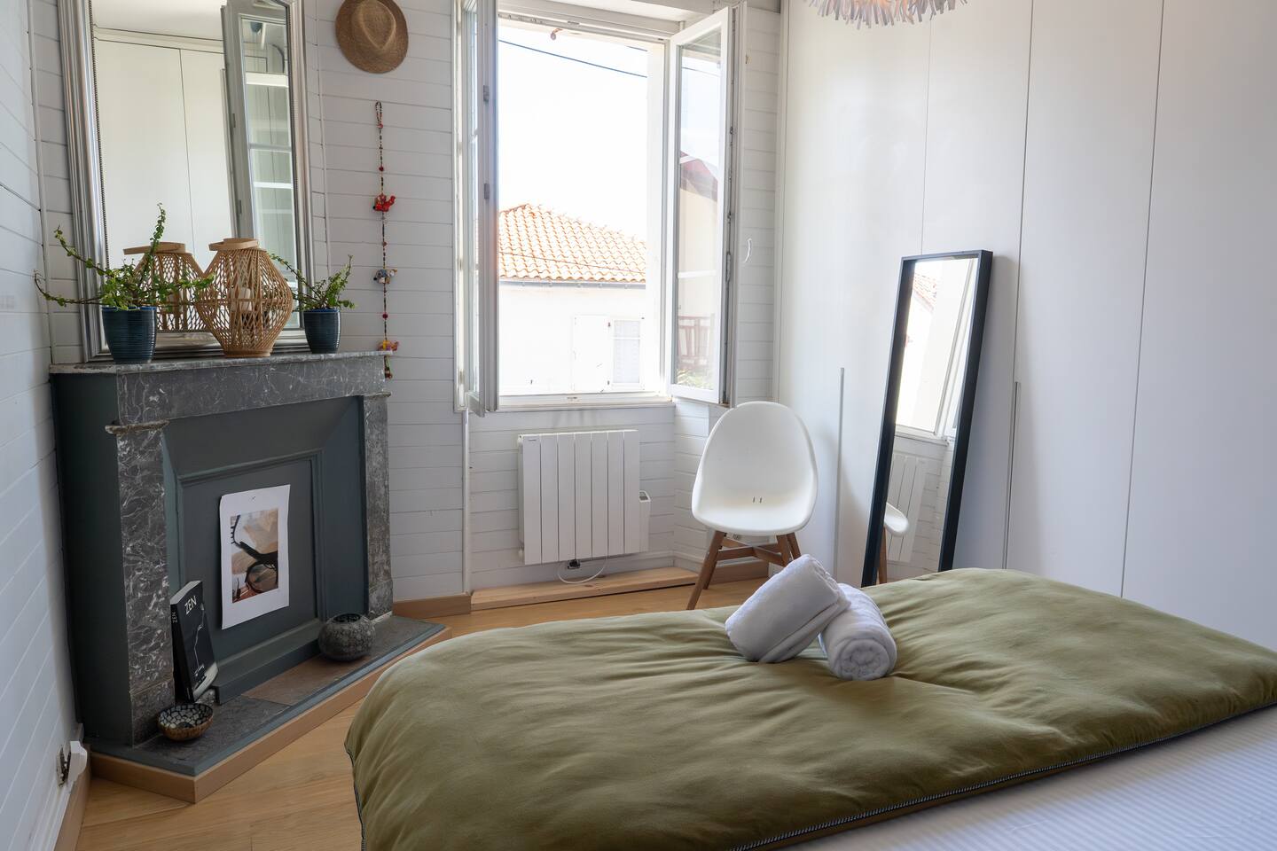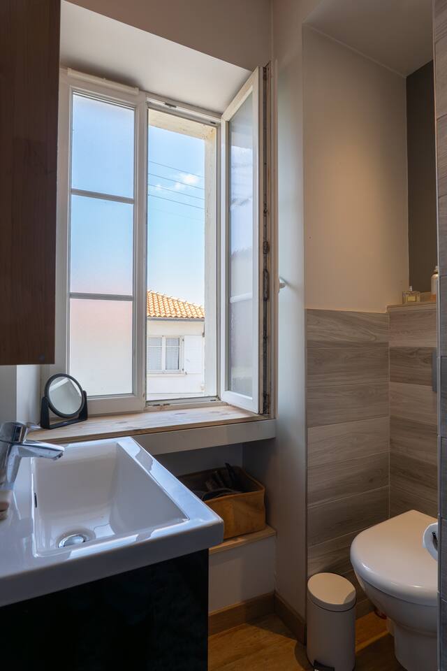 L’appartement est parfaitement agencé et s’organise le long d’un couloir ouvert dès l’entrée, offrant une belle circulation des espaces. La cuisine est entièrement ouverte : sur l’entrée, sur le salon, et sur un petit balcon exposé plein sud. Elle est équipée d’une plaque vitrocéramique, d’un four, d’un lave-vaisselle et d’un grand réfrigérateur. Une jolie table en bois ancien et parements de fer au centre, pour des repas conviviaux. A noter que la cuisine n'est pas équipée de micro-ondes ni de congélateur. Le salon, accessible à la fois depuis le couloir et la cuisine, propose de nombreuses assises avec un grand divan et s’ouvre sur un balcon filant le long de la façade. Au fond du couloir se trouvent les deux chambres exposées ouest, ainsi qu’une salle d’eau moderne, équipée d'un toilette, lavabo et d'une douche : Chambre 1 : lit double en 160 cm Chambre 2 : deux lits superposés en 120 cm, parfaits pour enfants ou amis