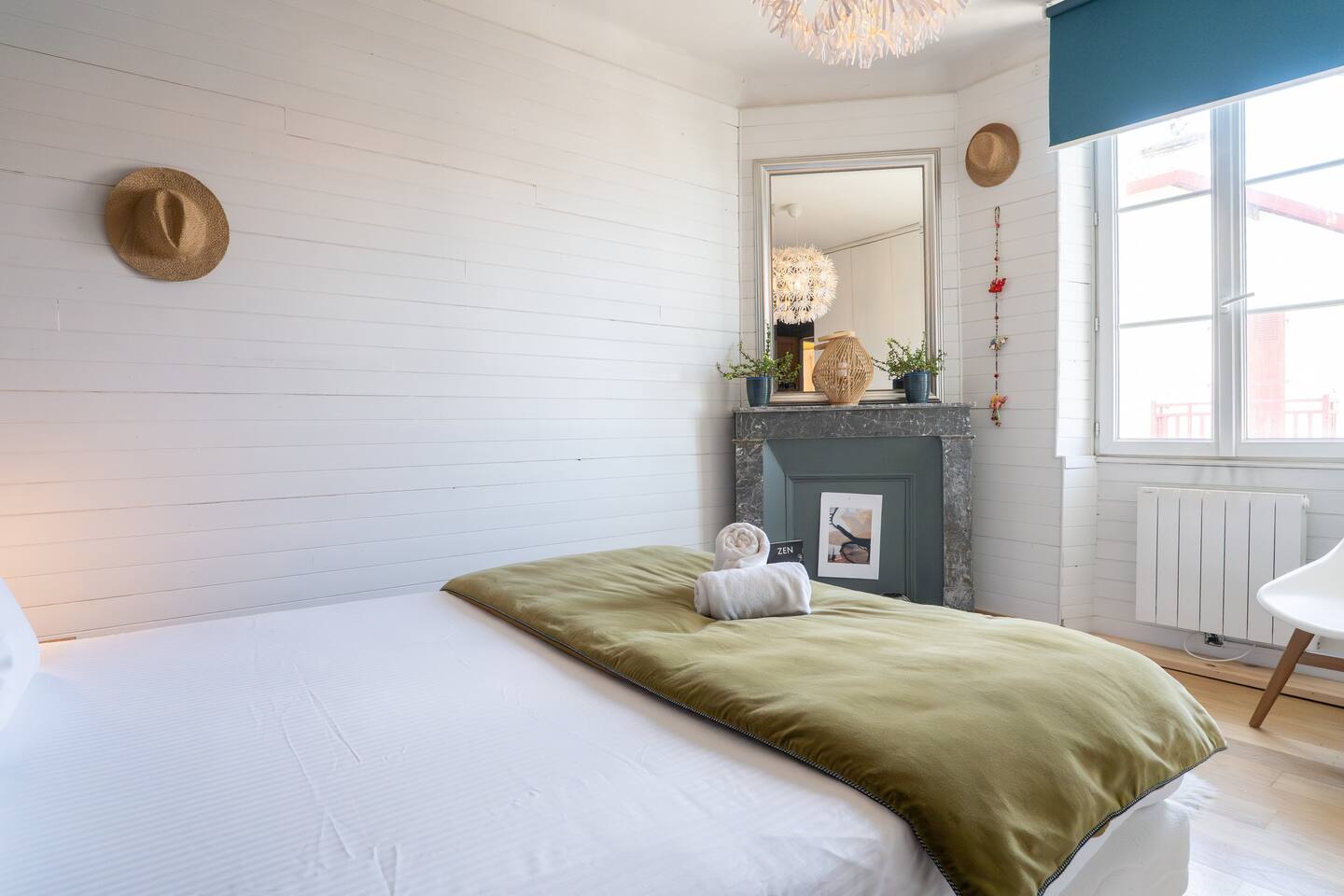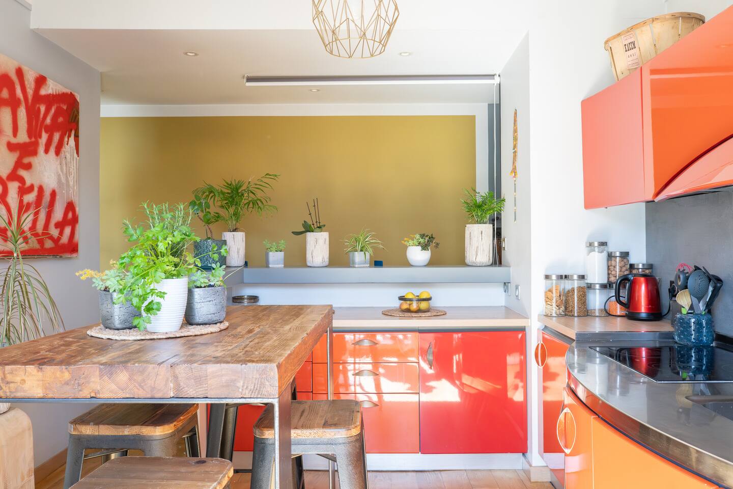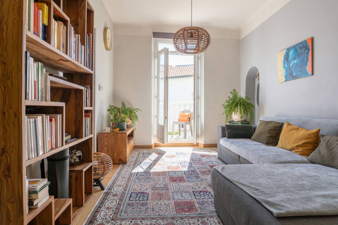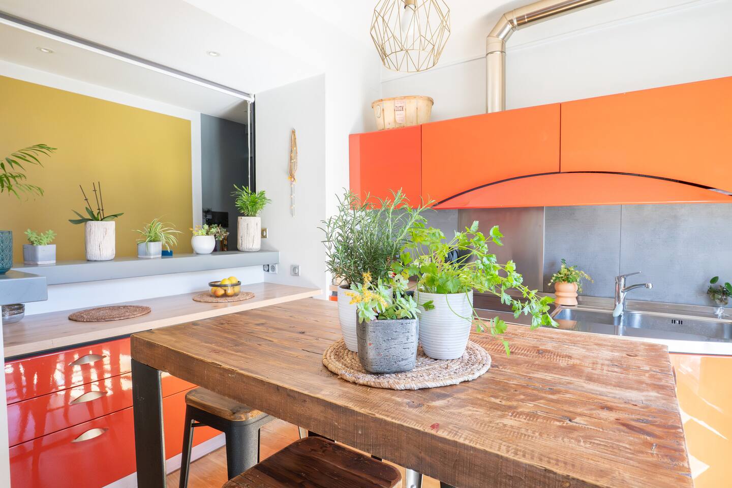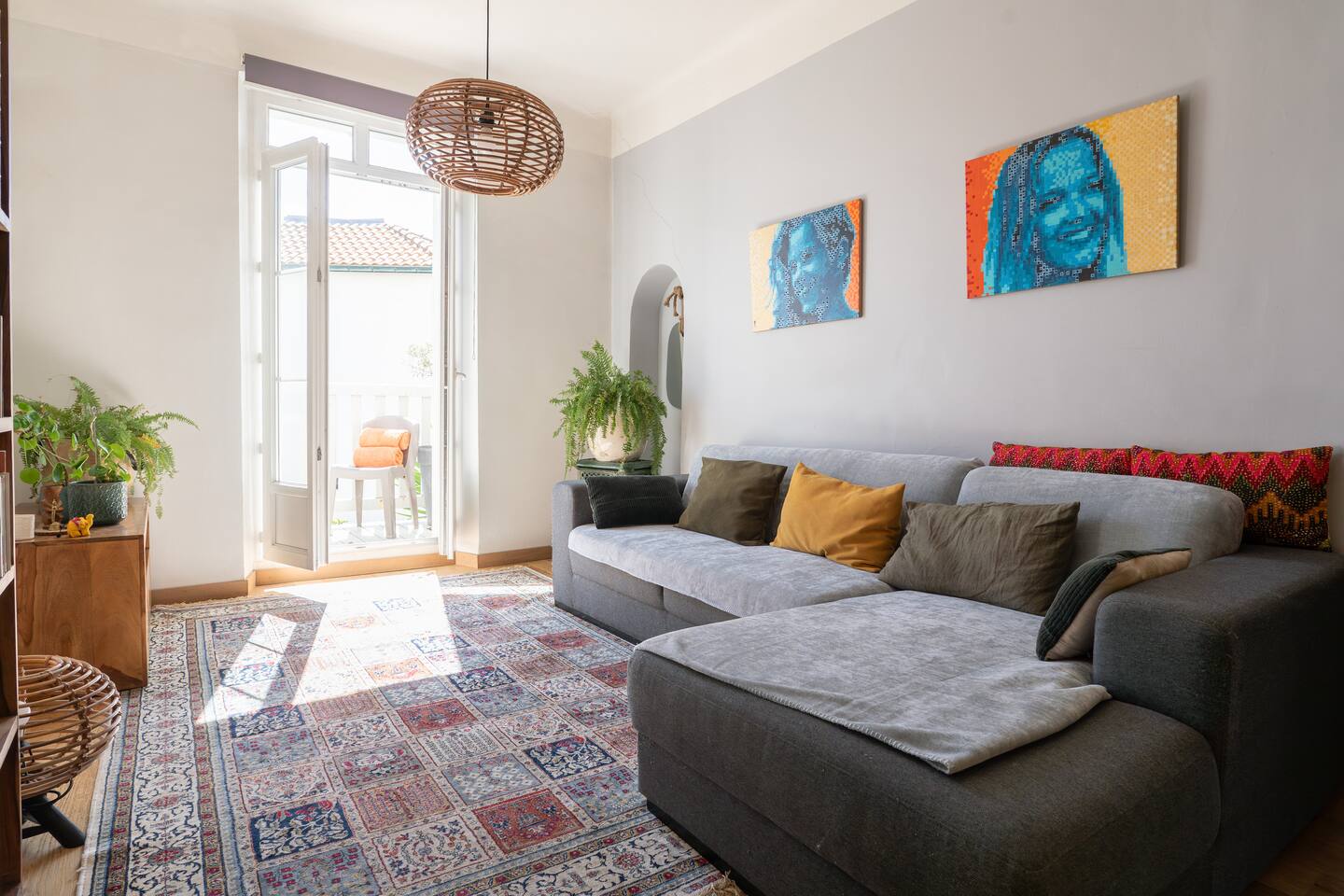 L’appartement est parfaitement agencé et s’organise le long d’un couloir ouvert dès l’entrée, offrant une belle circulation des espaces. La cuisine est entièrement ouverte : sur l’entrée, sur le salon, et sur un petit balcon exposé plein sud. Elle est équipée d’une plaque vitrocéramique, d’un four, d’un lave-vaisselle et d’un grand réfrigérateur. Une jolie table en bois ancien et parements de fer au centre, pour des repas conviviaux. A noter que la cuisine n'est pas équipée de micro-ondes ni de congélateur. Le salon, accessible à la fois depuis le couloir et la cuisine, propose de nombreuses assises avec un grand divan et s’ouvre sur un balcon filant le long de la façade. Au fond du couloir se trouvent les deux chambres exposées ouest, ainsi qu’une salle d’eau moderne, équipée d'un toilette, lavabo et d'une douche : Chambre 1 : lit double en 160 cm Chambre 2 : deux lits superposés en 120 cm, parfaits pour enfants ou amis