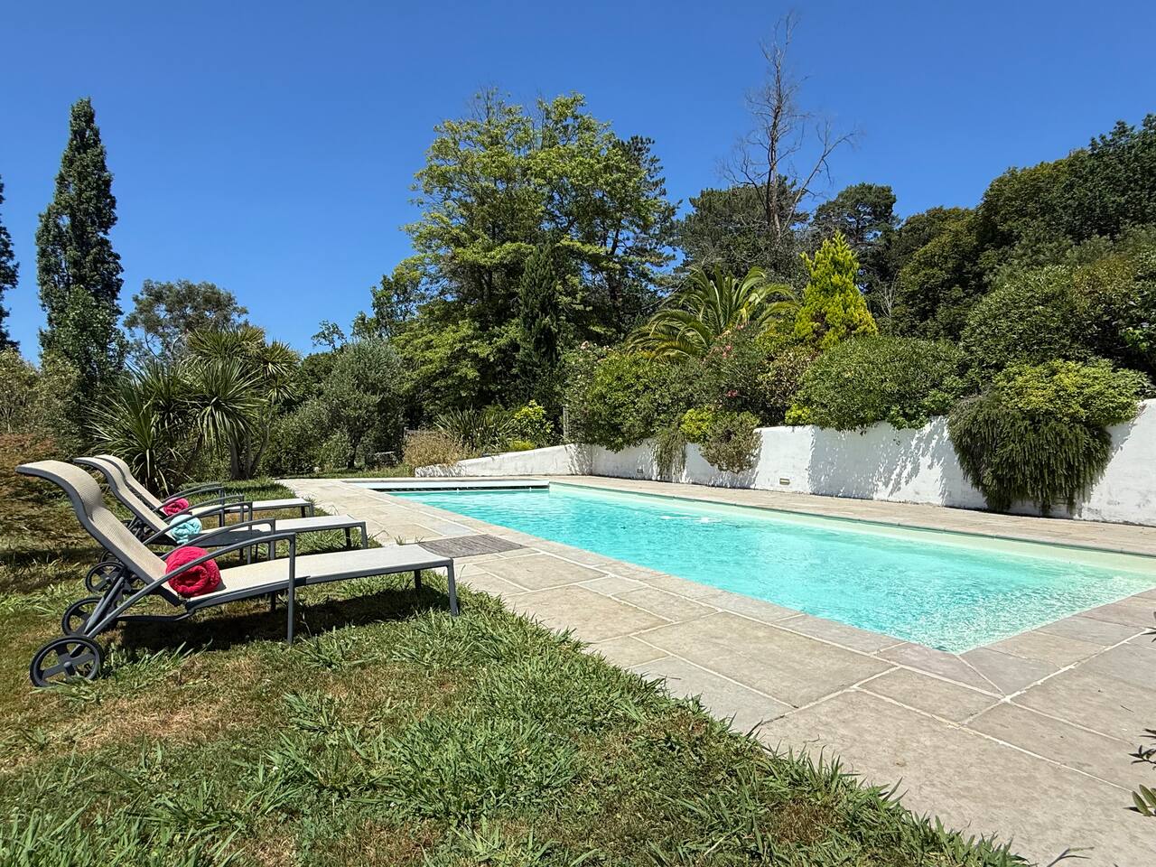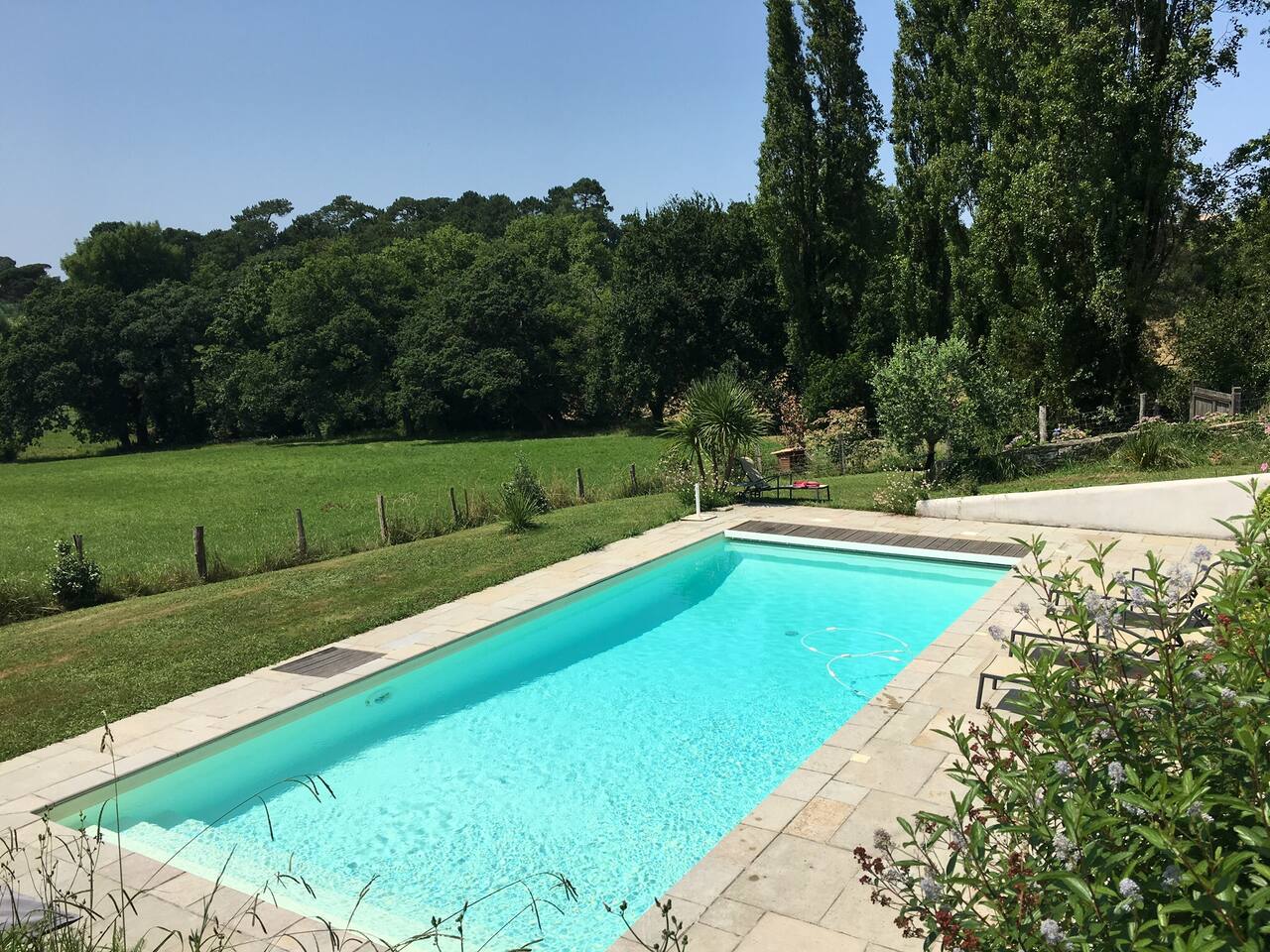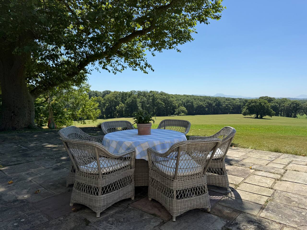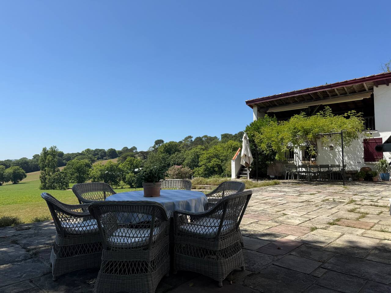 À l’intérieur, le charme opère immédiatement. Le salon s’ouvre en deux espaces de vie : d’un côté, un piano ancien, une bibliothèque garnie, des portraits, des bustes, des gravures, et de l’autre, un coin plus intime réchauffé par une cheminée charentaise monumentale en pierre. Chaque meuble, chaque objet semble avoir voyagé avant de trouver sa place ici. La salle à manger, elle aussi avec une cheminée en pierre avec broche rotissoire accueille les repas dans une ambiance feutrée et élégante, sous le regard d’un buffet classique avec de la vaisselle ancienne et des oiseaux en céramique. La cuisine traditionnelle basque, vaste et accueillante, invite à la convivialité. On y prépare les produits du marché, on y partage les repas du matin comme les plats mijotés du soir. Les chambres, réparties dans la maison, sont toutes différentes. Mobiliers anciens, étoffes naturelles, objets patinés par le temps : elles incarnent la douceur, le calme, l’harmonie. Mais Enea Agiri, c’est aussi un monde extérieur à part entière. Dès les premières marches de la terrasse, le regard se perd dans une vaste plaine ouverte, bordée d’arbres centenaires. La vue est saisissante, avec en toile de fond les montagnes du Pays Basque. Un sentiment de liberté vous enveloppe. Sous la véranda végétale, les repas d’été se déroulent dans la fraîcheur naturelle d’une tonnelle vivante, où les feuillages filtrent la lumière. Plus loin, une autre terrasse, plus intime, s’abrite sous un grand platane, parfaite pour les petits-déjeuners tranquilles ou les soirées douces. La piscine, entourée de végétation, s’intègre parfaitement au paysage. Elle offre un coin de fraîcheur et de silence, comme suspendu dans le temps. Le jardin, immense et ouvert, laisse place aux jeux d’enfants, aux siestes à l’ombre ou aux simples balades les pieds nus dans l’herbe. Partout, la nature est là, généreuse, enveloppante. À seulement deux kilomètres du village d’Arcangues, à cinq minutes du golf, à sept minutes de la gare de Biarritz, dix des plages et quinze de l’aéroport, Enea Agiri est un point d’ancrage idéal pour découvrir la région, ou simplement s’y poser, sans autre programme que celui de respirer. Enea Agiri, c’est une maison de caractère et de cœur. Un lieu qui rassemble, qui apaise, qui inspire. Enea Agiri vous attend.
