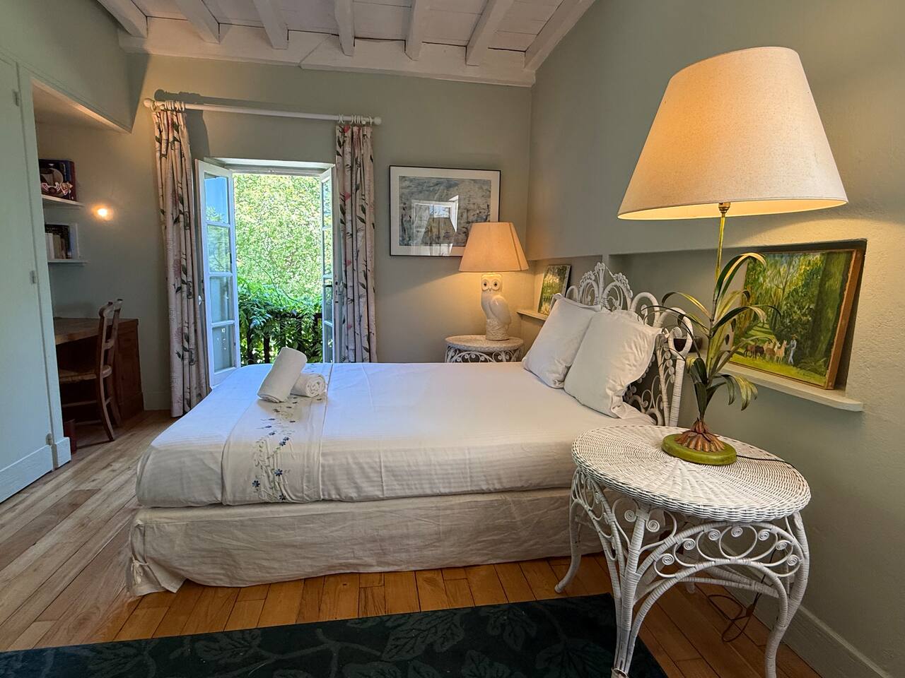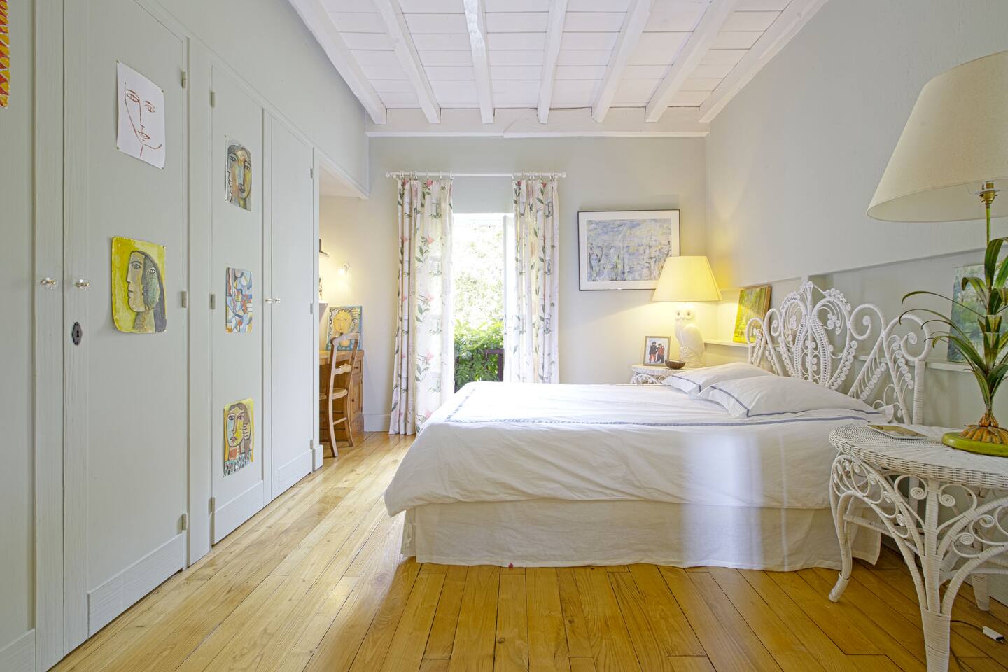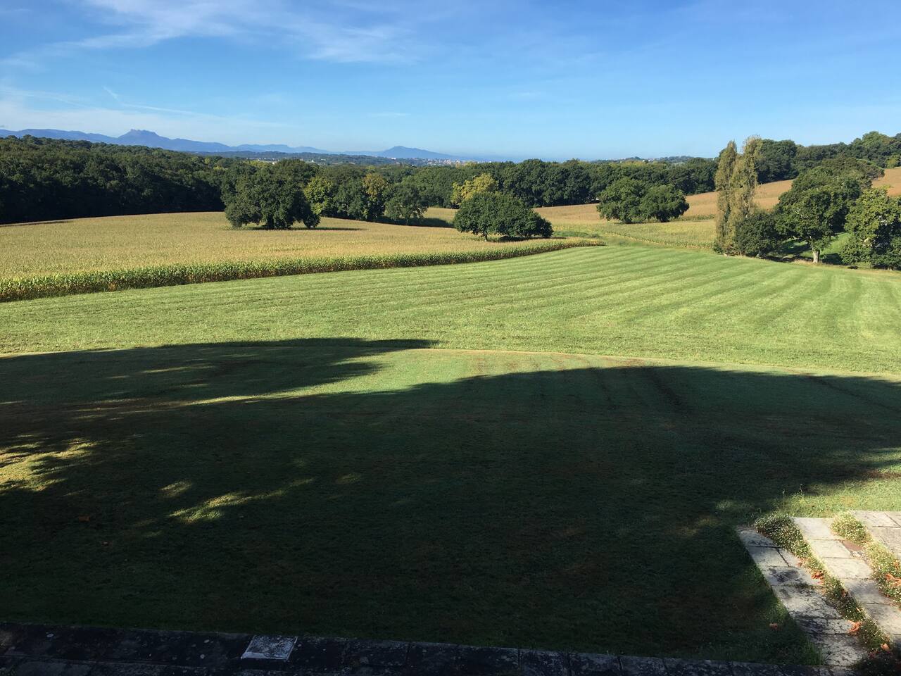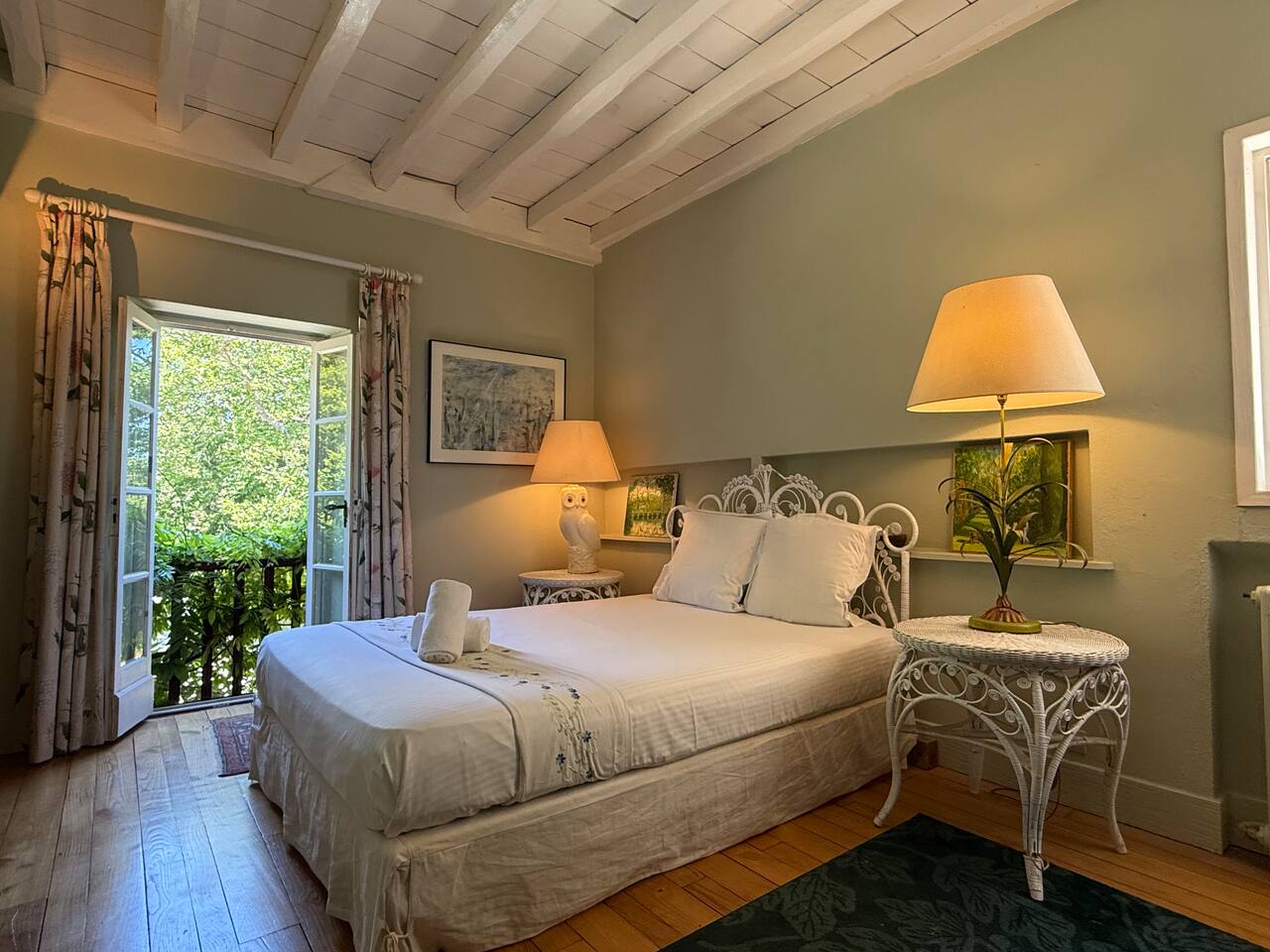 À l’intérieur, le charme opère immédiatement. Le salon s’ouvre en deux espaces de vie : d’un côté, un piano ancien, une bibliothèque garnie, des portraits, des bustes, des gravures, et de l’autre, un coin plus intime réchauffé par une cheminée charentaise monumentale en pierre. Chaque meuble, chaque objet semble avoir voyagé avant de trouver sa place ici. La salle à manger, elle aussi avec une cheminée en pierre avec broche rotissoire accueille les repas dans une ambiance feutrée et élégante, sous le regard d’un buffet classique avec de la vaisselle ancienne et des oiseaux en céramique. La cuisine traditionnelle basque, vaste et accueillante, invite à la convivialité. On y prépare les produits du marché, on y partage les repas du matin comme les plats mijotés du soir. Les chambres, réparties dans la maison, sont toutes différentes. Mobiliers anciens, étoffes naturelles, objets patinés par le temps : elles incarnent la douceur, le calme, l’harmonie. Mais Enea Agiri, c’est aussi un monde extérieur à part entière. Dès les premières marches de la terrasse, le regard se perd dans une vaste plaine ouverte, bordée d’arbres centenaires. La vue est saisissante, avec en toile de fond les montagnes du Pays Basque. Un sentiment de liberté vous enveloppe. Sous la véranda végétale, les repas d’été se déroulent dans la fraîcheur naturelle d’une tonnelle vivante, où les feuillages filtrent la lumière. Plus loin, une autre terrasse, plus intime, s’abrite sous un grand platane, parfaite pour les petits-déjeuners tranquilles ou les soirées douces. La piscine, entourée de végétation, s’intègre parfaitement au paysage. Elle offre un coin de fraîcheur et de silence, comme suspendu dans le temps. Le jardin, immense et ouvert, laisse place aux jeux d’enfants, aux siestes à l’ombre ou aux simples balades les pieds nus dans l’herbe. Partout, la nature est là, généreuse, enveloppante. À seulement deux kilomètres du village d’Arcangues, à cinq minutes du golf, à sept minutes de la gare de Biarritz, dix des plages et quinze de l’aéroport, Enea Agiri est un point d’ancrage idéal pour découvrir la région, ou simplement s’y poser, sans autre programme que celui de respirer. Enea Agiri, c’est une maison de caractère et de cœur. Un lieu qui rassemble, qui apaise, qui inspire. Enea Agiri vous attend.