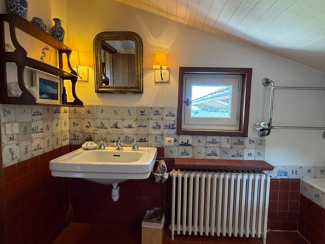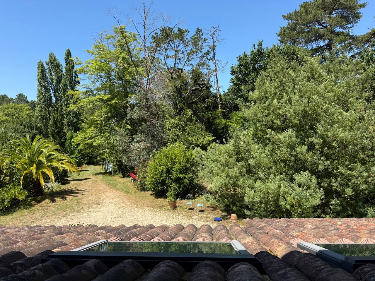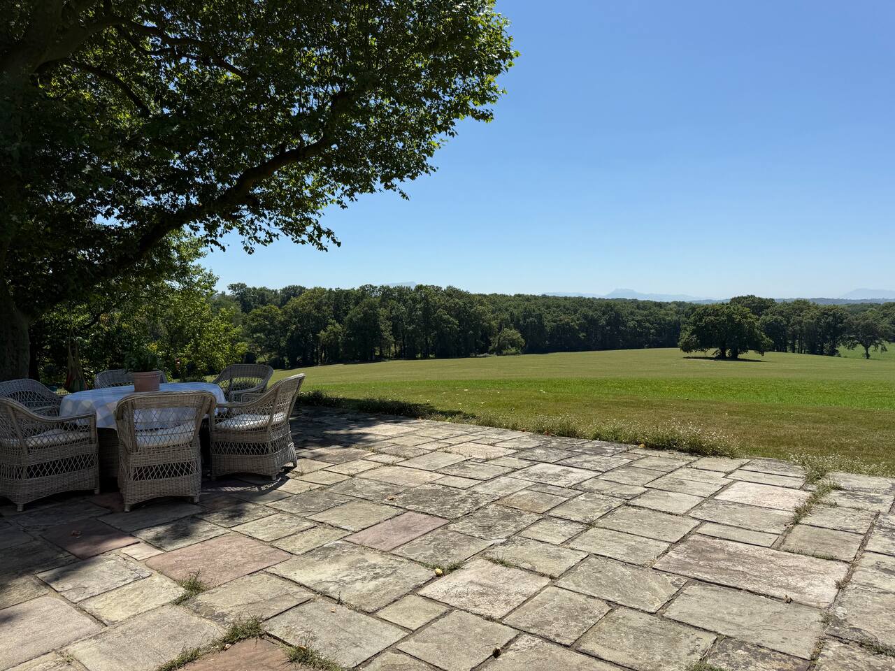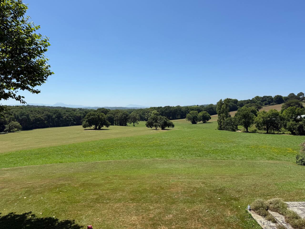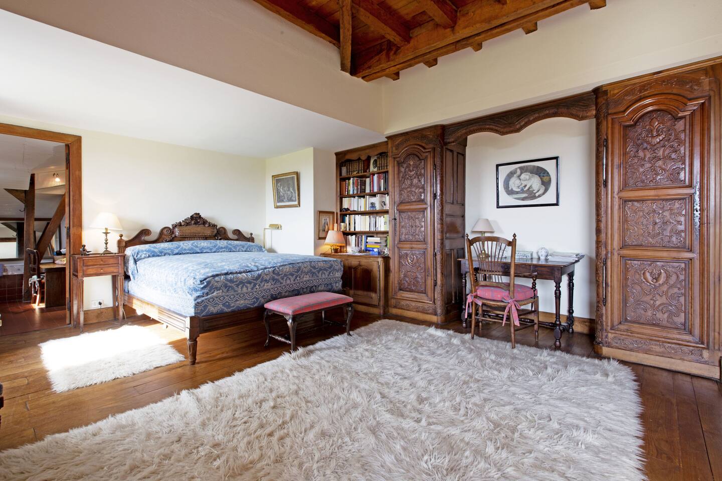 À l’intérieur, le charme opère immédiatement. Le salon s’ouvre en deux espaces de vie : d’un côté, un piano ancien, une bibliothèque garnie, des portraits, des bustes, des gravures, et de l’autre, un coin plus intime réchauffé par une cheminée charentaise monumentale en pierre. Chaque meuble, chaque objet semble avoir voyagé avant de trouver sa place ici. La salle à manger, elle aussi avec une cheminée en pierre avec broche rotissoire accueille les repas dans une ambiance feutrée et élégante, sous le regard d’un buffet classique avec de la vaisselle ancienne et des oiseaux en céramique. La cuisine traditionnelle basque, vaste et accueillante, invite à la convivialité. On y prépare les produits du marché, on y partage les repas du matin comme les plats mijotés du soir. Les chambres, réparties dans la maison, sont toutes différentes. Mobiliers anciens, étoffes naturelles, objets patinés par le temps : elles incarnent la douceur, le calme, l’harmonie. Mais Enea Agiri, c’est aussi un monde extérieur à part entière. Dès les premières marches de la terrasse, le regard se perd dans une vaste plaine ouverte, bordée d’arbres centenaires. La vue est saisissante, avec en toile de fond les montagnes du Pays Basque. Un sentiment de liberté vous enveloppe. Sous la véranda végétale, les repas d’été se déroulent dans la fraîcheur naturelle d’une tonnelle vivante, où les feuillages filtrent la lumière. Plus loin, une autre terrasse, plus intime, s’abrite sous un grand platane, parfaite pour les petits-déjeuners tranquilles ou les soirées douces. La piscine, entourée de végétation, s’intègre parfaitement au paysage. Elle offre un coin de fraîcheur et de silence, comme suspendu dans le temps. Le jardin, immense et ouvert, laisse place aux jeux d’enfants, aux siestes à l’ombre ou aux simples balades les pieds nus dans l’herbe. Partout, la nature est là, généreuse, enveloppante. À seulement deux kilomètres du village d’Arcangues, à cinq minutes du golf, à sept minutes de la gare de Biarritz, dix des plages et quinze de l’aéroport, Enea Agiri est un point d’ancrage idéal pour découvrir la région, ou simplement s’y poser, sans autre programme que celui de respirer. Enea Agiri, c’est une maison de caractère et de cœur. Un lieu qui rassemble, qui apaise, qui inspire. Enea Agiri vous attend.