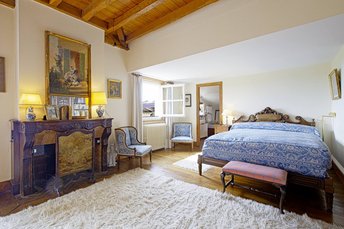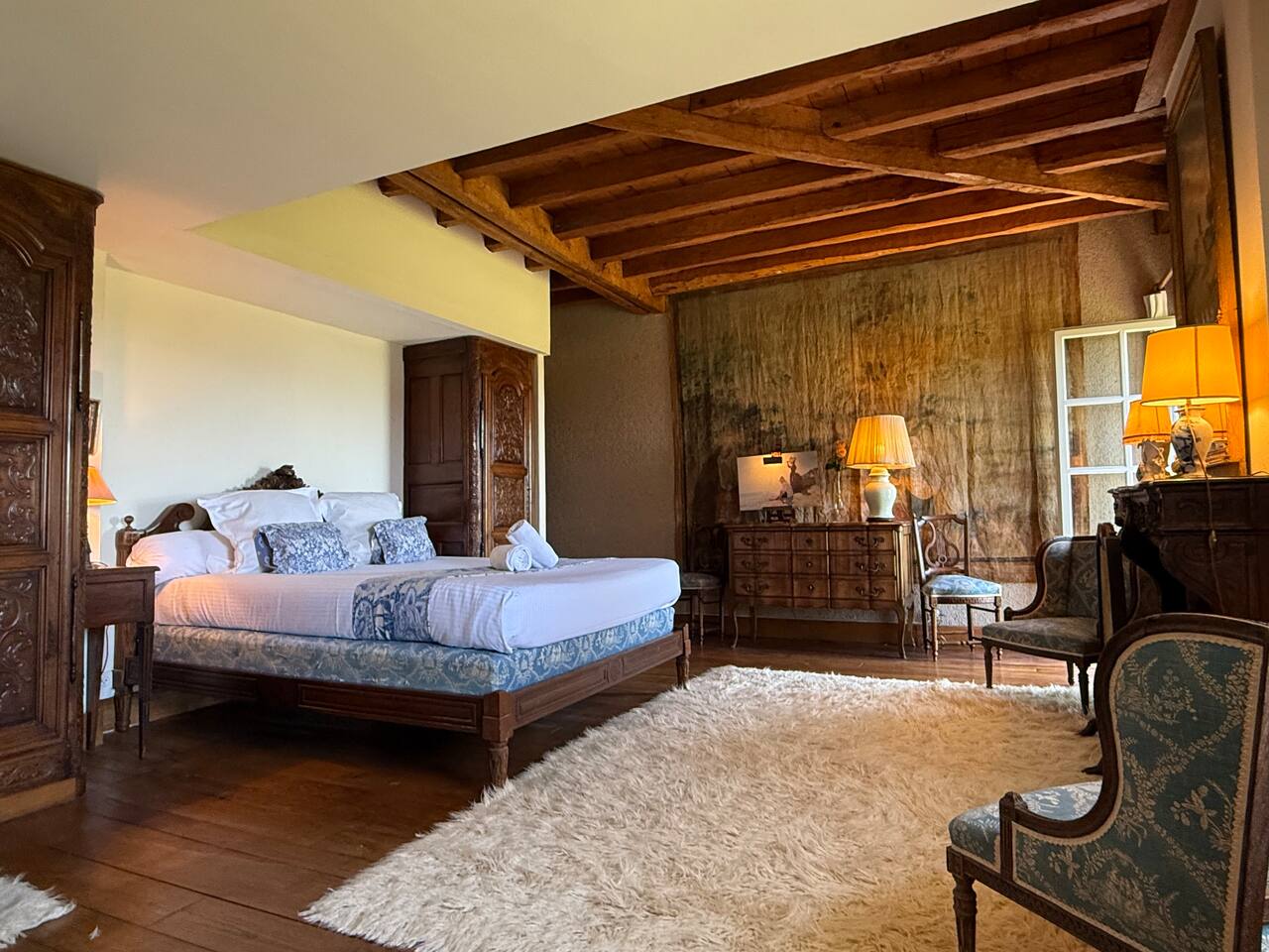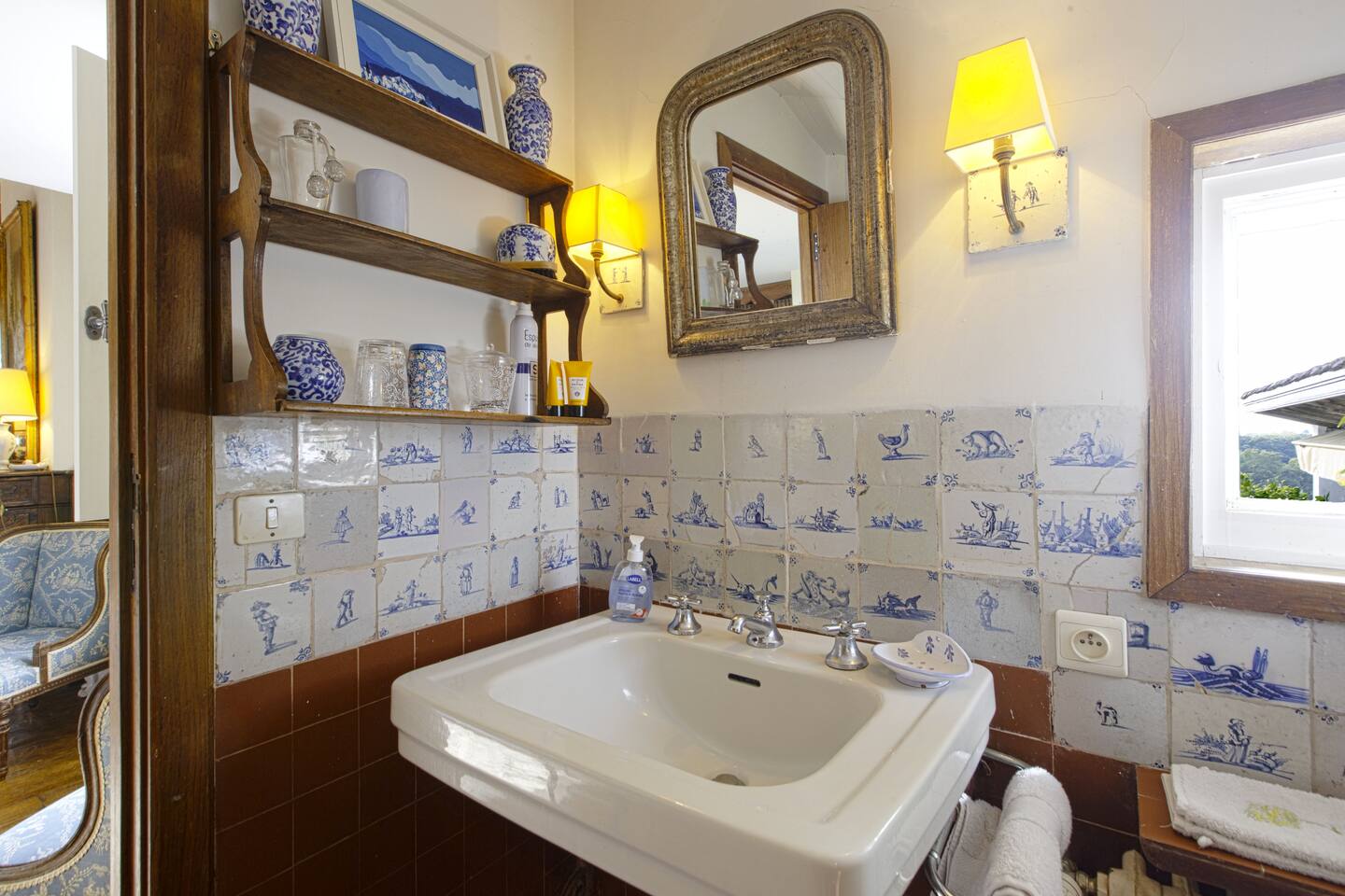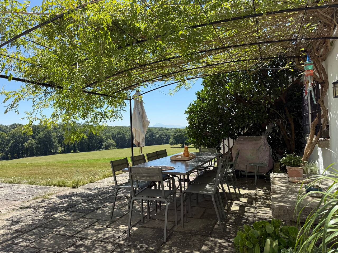 À l’intérieur, le charme opère immédiatement. Le salon s’ouvre en deux espaces de vie : d’un côté, un piano ancien, une bibliothèque garnie, des portraits, des bustes, des gravures, et de l’autre, un coin plus intime réchauffé par une cheminée charentaise monumentale en pierre. Chaque meuble, chaque objet semble avoir voyagé avant de trouver sa place ici. La salle à manger, elle aussi avec une cheminée en pierre avec broche rotissoire accueille les repas dans une ambiance feutrée et élégante, sous le regard d’un buffet classique avec de la vaisselle ancienne et des oiseaux en céramique. La cuisine traditionnelle basque, vaste et accueillante, invite à la convivialité. On y prépare les produits du marché, on y partage les repas du matin comme les plats mijotés du soir. Les chambres, réparties dans la maison, sont toutes différentes. Mobiliers anciens, étoffes naturelles, objets patinés par le temps : elles incarnent la douceur, le calme, l’harmonie. Mais Enea Agiri, c’est aussi un monde extérieur à part entière. Dès les premières marches de la terrasse, le regard se perd dans une vaste plaine ouverte, bordée d’arbres centenaires. La vue est saisissante, avec en toile de fond les montagnes du Pays Basque. Un sentiment de liberté vous enveloppe. Sous la véranda végétale, les repas d’été se déroulent dans la fraîcheur naturelle d’une tonnelle vivante, où les feuillages filtrent la lumière. Plus loin, une autre terrasse, plus intime, s’abrite sous un grand platane, parfaite pour les petits-déjeuners tranquilles ou les soirées douces. La piscine, entourée de végétation, s’intègre parfaitement au paysage. Elle offre un coin de fraîcheur et de silence, comme suspendu dans le temps. Le jardin, immense et ouvert, laisse place aux jeux d’enfants, aux siestes à l’ombre ou aux simples balades les pieds nus dans l’herbe. Partout, la nature est là, généreuse, enveloppante. À seulement deux kilomètres du village d’Arcangues, à cinq minutes du golf, à sept minutes de la gare de Biarritz, dix des plages et quinze de l’aéroport, Enea Agiri est un point d’ancrage idéal pour découvrir la région, ou simplement s’y poser, sans autre programme que celui de respirer. Enea Agiri, c’est une maison de caractère et de cœur. Un lieu qui rassemble, qui apaise, qui inspire. Enea Agiri vous attend.