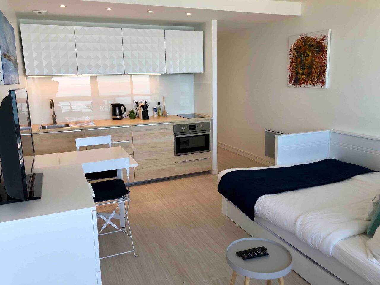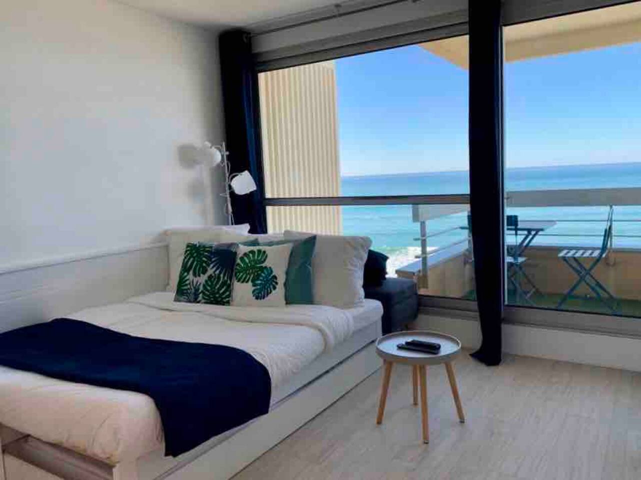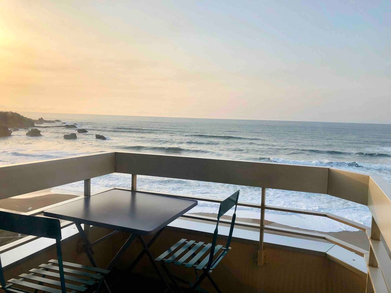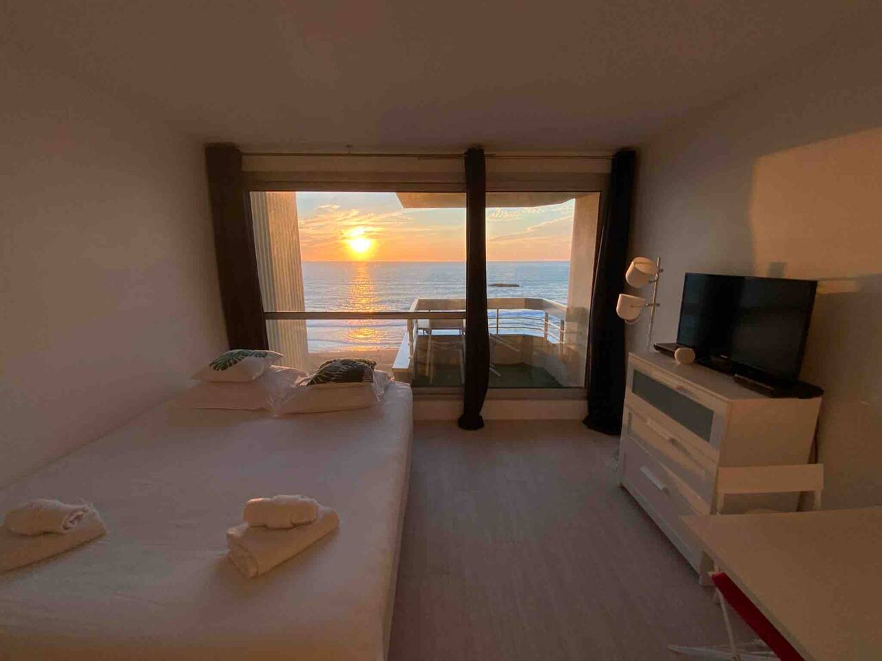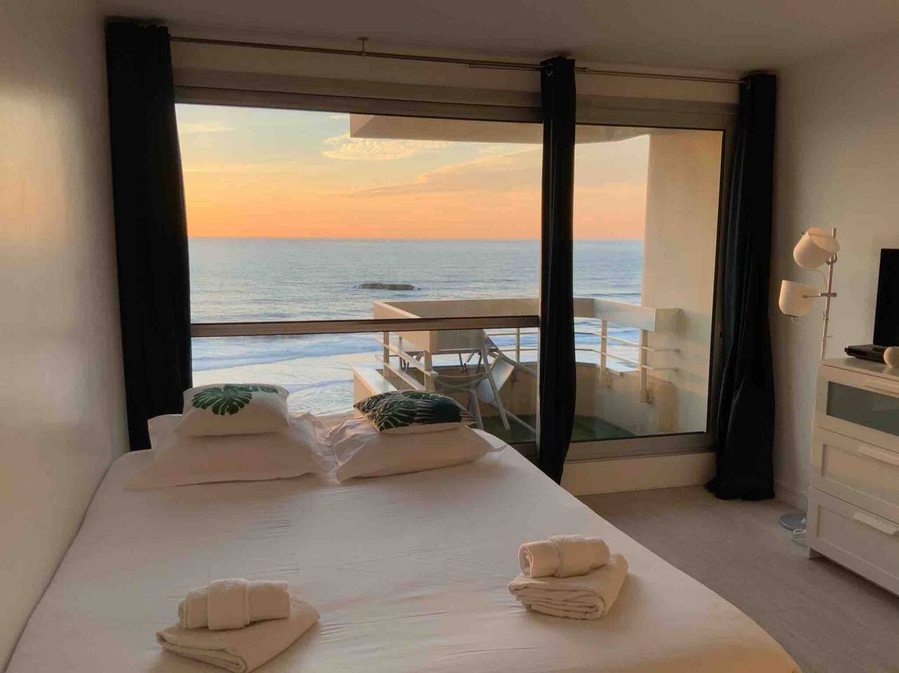 L'appartement Horizonte est aussi disponible sur notre site Destination Côte Basque. Ce studio accueillant a été entièrement rénové et offre une atmosphère lumineuse. Situé au 6éme étage, il offre une vue imprenable sur la mer et est conçu pour votre confort avec un lit double en 160. L’espace est bien équipé avec tout ce dont vous avez besoin pour un séjour agréable. Vous aurez accès à une cuisine ouverte entièrement équipée (plaques à induction, micro-onde/grill, frigo, machine à café Nespresso...), des espaces de vie confortables (Petite table pour déjeuner ou travailler tranquillement), ainsi qu’aux indispensables comme le Wi-Fi ou la TV avec un ensembles de chaines disponibles. Vous disposerez d’une salle d’eau avec douche et WC indépendants. ✔ Studio entièrement rénové ✔ Balcon avec vue imprenable sur l’océan et le coucher de soleil ✔ Accès direct à la Grande Plage et au front de mer ✔ Accès à la piscine (juin à septembre) ✔ Cuisine bien équipée avec articles de cuisine essentiels ✔ Résidence calme et sécurisée avec ascenseur ✔bars, restaurants, shopping à pied