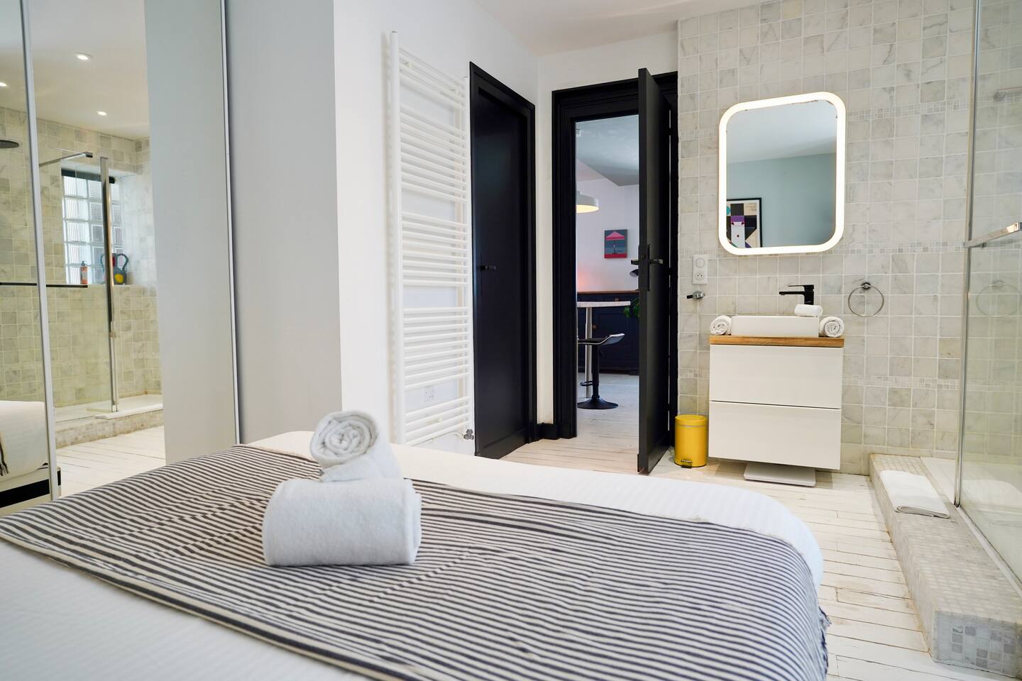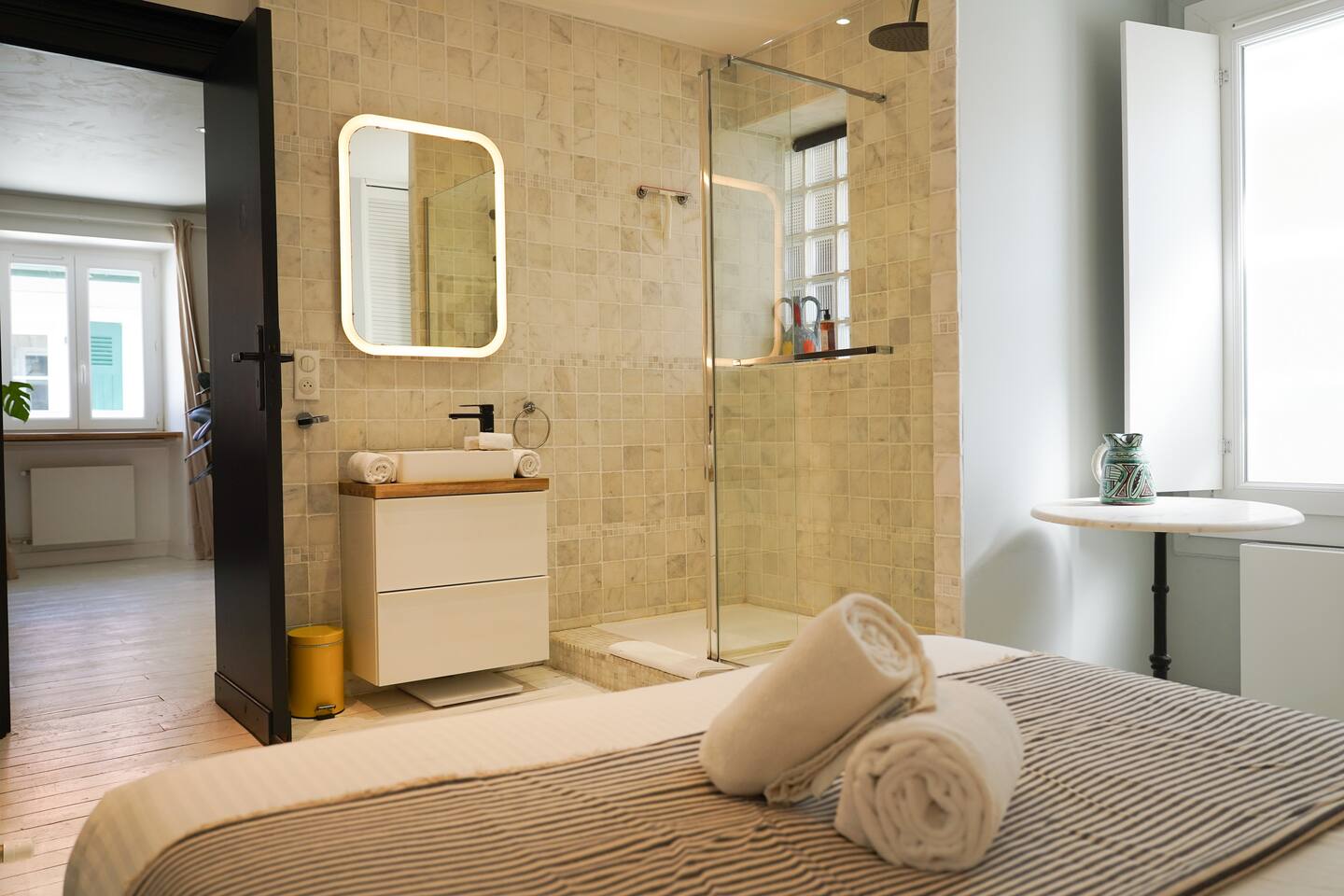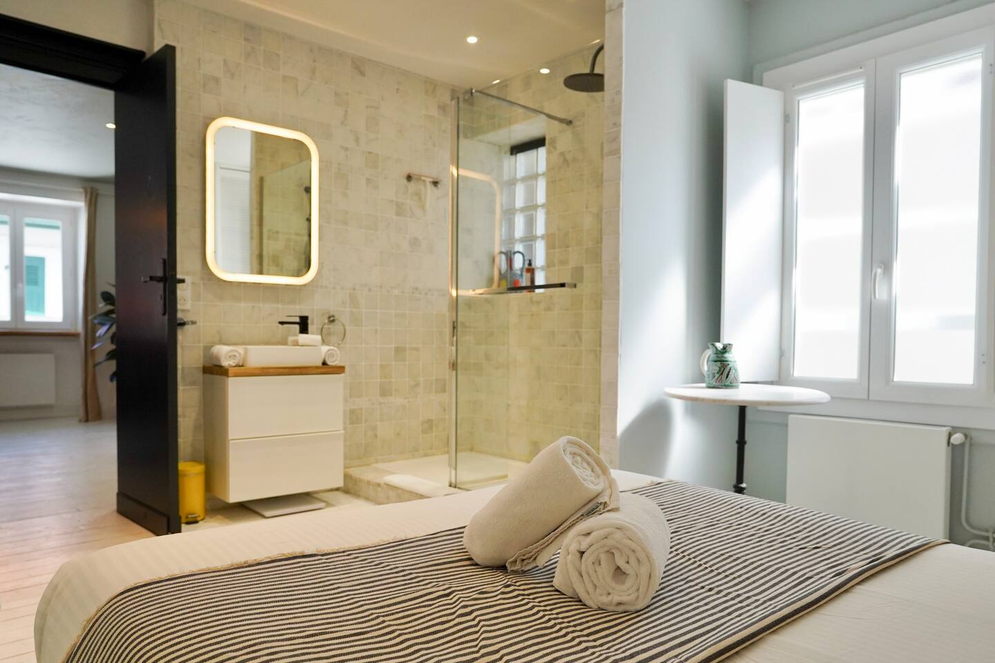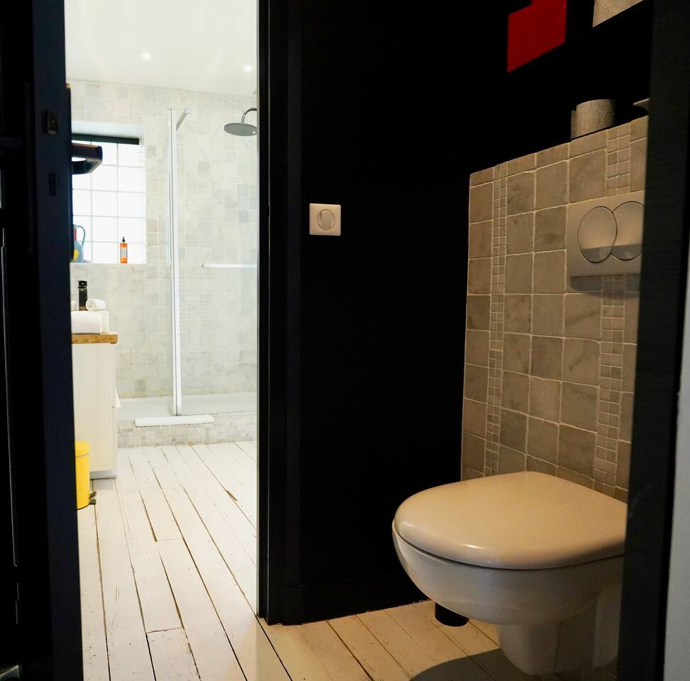 Vous serez séduit par la décoration douce et les équipements de qualité de cet appartement, qui allie confort et style. Une place de parking privée est également à votre disposition pour plus de commodité. L'appartement est entièrement dédié à nos hôtes, vous offrant un espace cosy et fonctionnel comprenant : Une cuisine contemporaine entièrement équipée, ouverte sur un salon lumineux. Idéale pour préparer vos repas tout en restant en contact avec vos proches. Un espace repas pouvant accueillir jusqu'à 4 personnes et un salon avec une décoration moderne, offrant tout le confort nécessaire pour un séjour agréable. Deux chambres confortables : La première chambre est également équipée d’un lit double, de rangements, et d’une salle de douche attenante avec une douche à l'italienne et un lavabo moderne. La deuxième chambre dispose d’un lit double et de rangements spacieux. Un WC séparé pour plus de confort. Pour que vous profitiez pleinement de votre séjour, nous mettons à votre disposition un lave-linge et un lave-vaisselle. Le linge de maison et de toilette est fourni sur place. La salle de bain est dans la chambre principale.