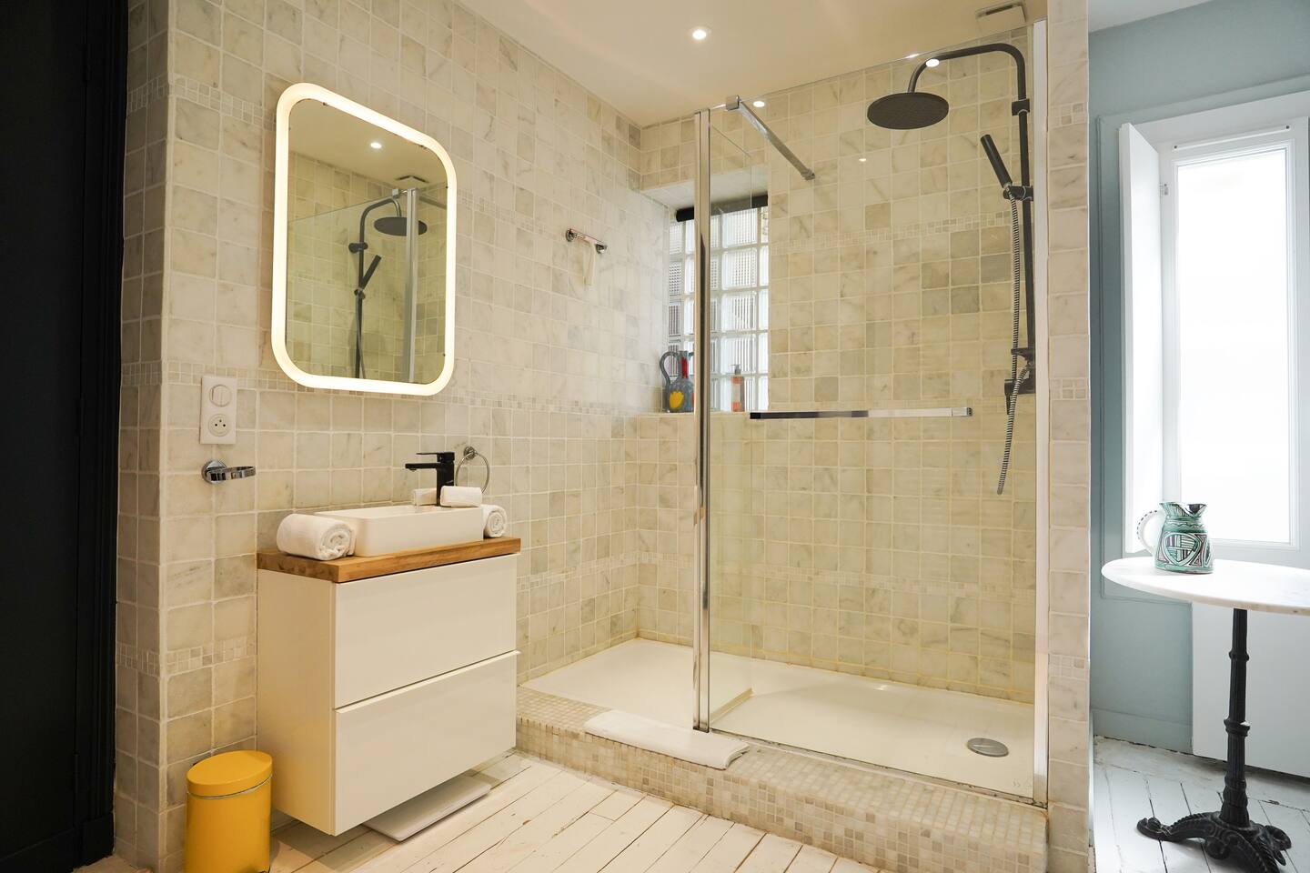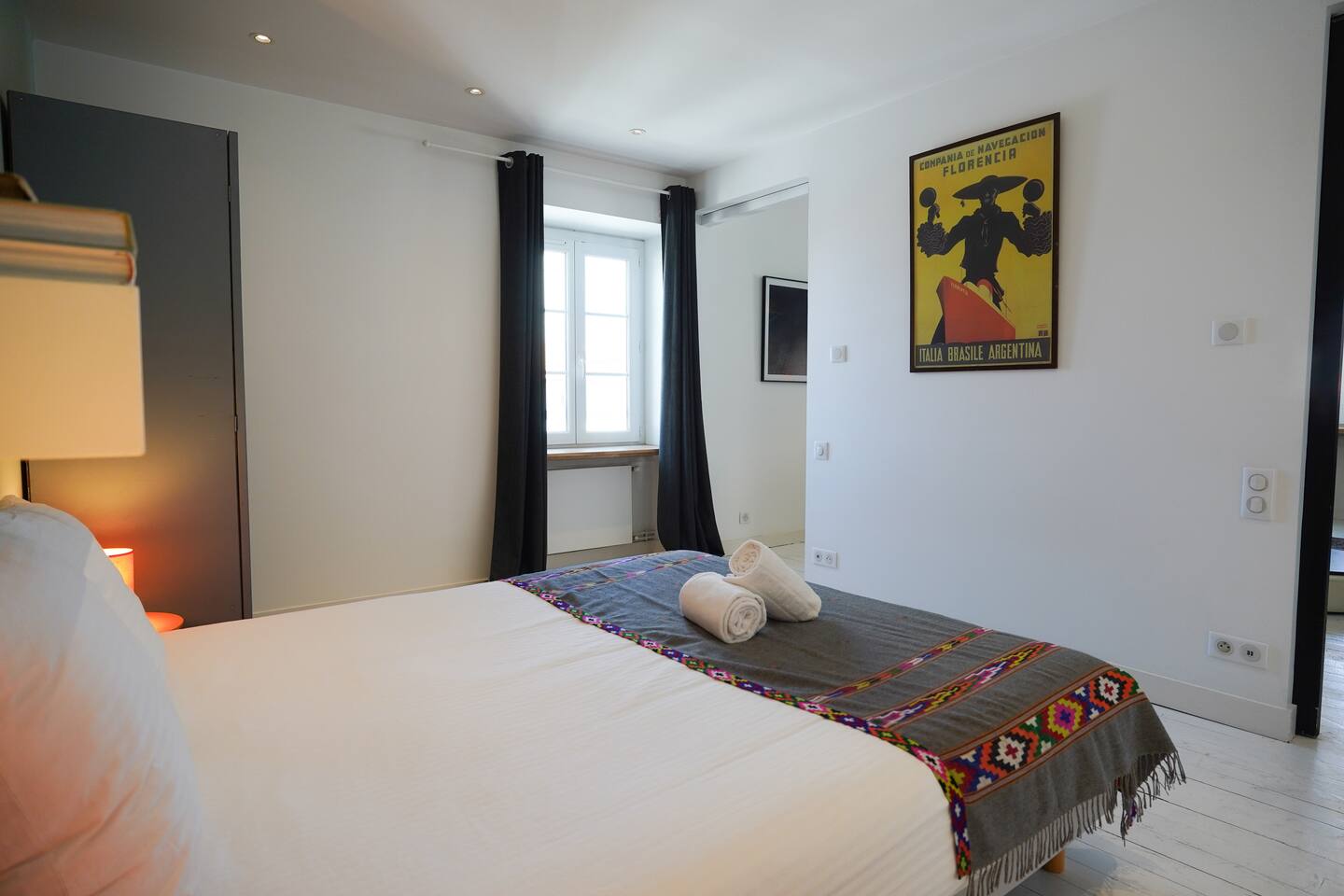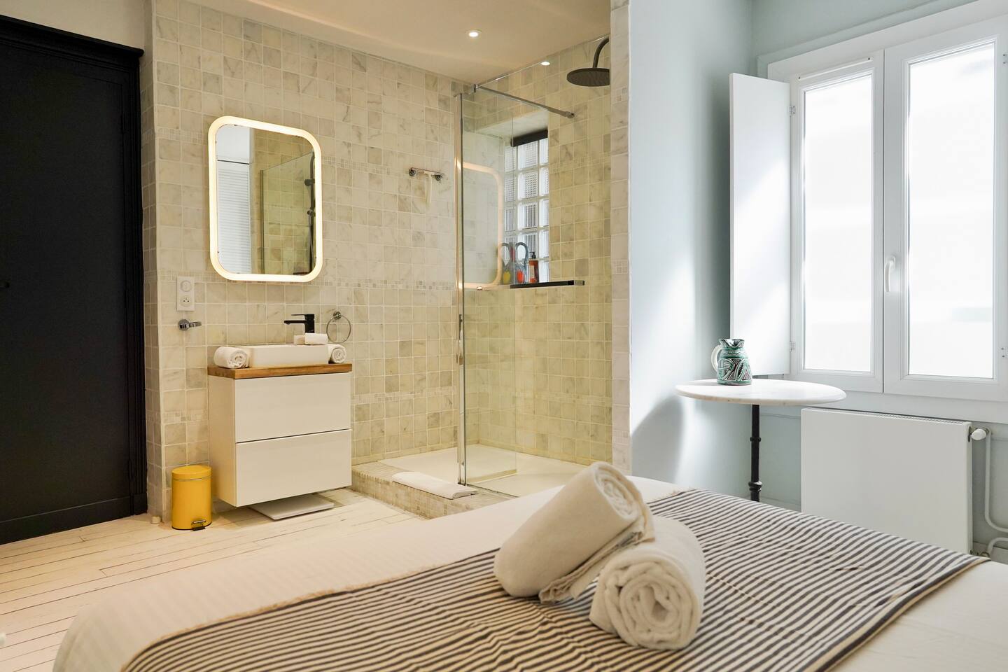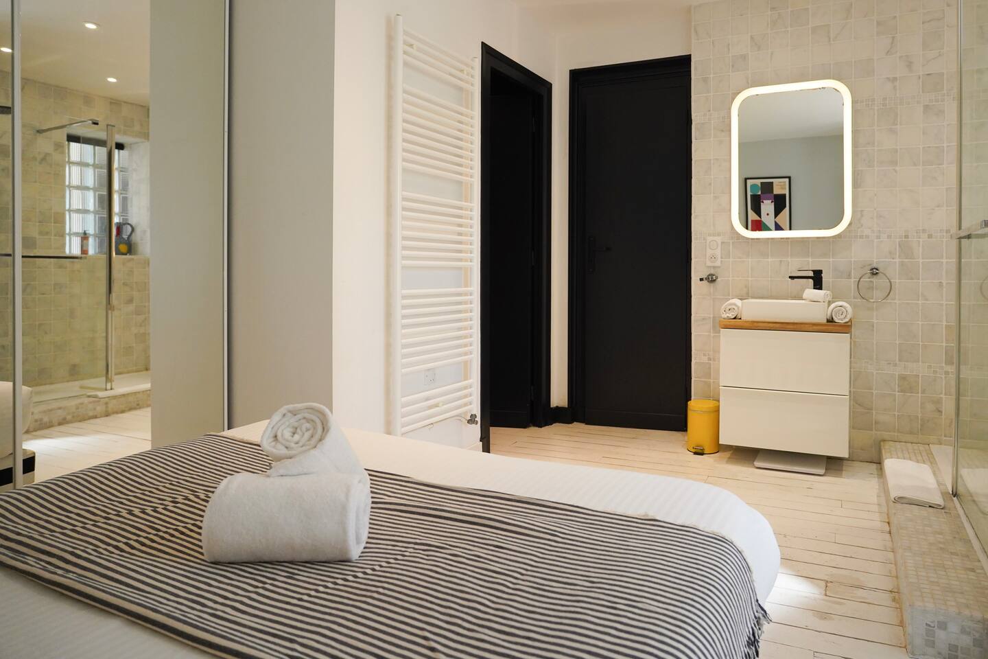 Vous serez séduit par la décoration douce et les équipements de qualité de cet appartement, qui allie confort et style. Une place de parking privée est également à votre disposition pour plus de commodité. L'appartement est entièrement dédié à nos hôtes, vous offrant un espace cosy et fonctionnel comprenant : Une cuisine contemporaine entièrement équipée, ouverte sur un salon lumineux. Idéale pour préparer vos repas tout en restant en contact avec vos proches. Un espace repas pouvant accueillir jusqu'à 4 personnes et un salon avec une décoration moderne, offrant tout le confort nécessaire pour un séjour agréable. Deux chambres confortables : La première chambre est également équipée d’un lit double, de rangements, et d’une salle de douche attenante avec une douche à l'italienne et un lavabo moderne. La deuxième chambre dispose d’un lit double et de rangements spacieux. Un WC séparé pour plus de confort. Pour que vous profitiez pleinement de votre séjour, nous mettons à votre disposition un lave-linge et un lave-vaisselle. Le linge de maison et de toilette est fourni sur place. La salle de bain est dans la chambre principale.