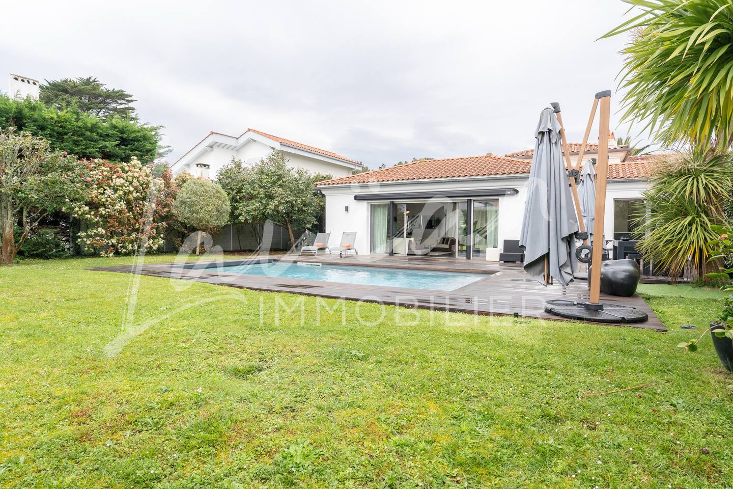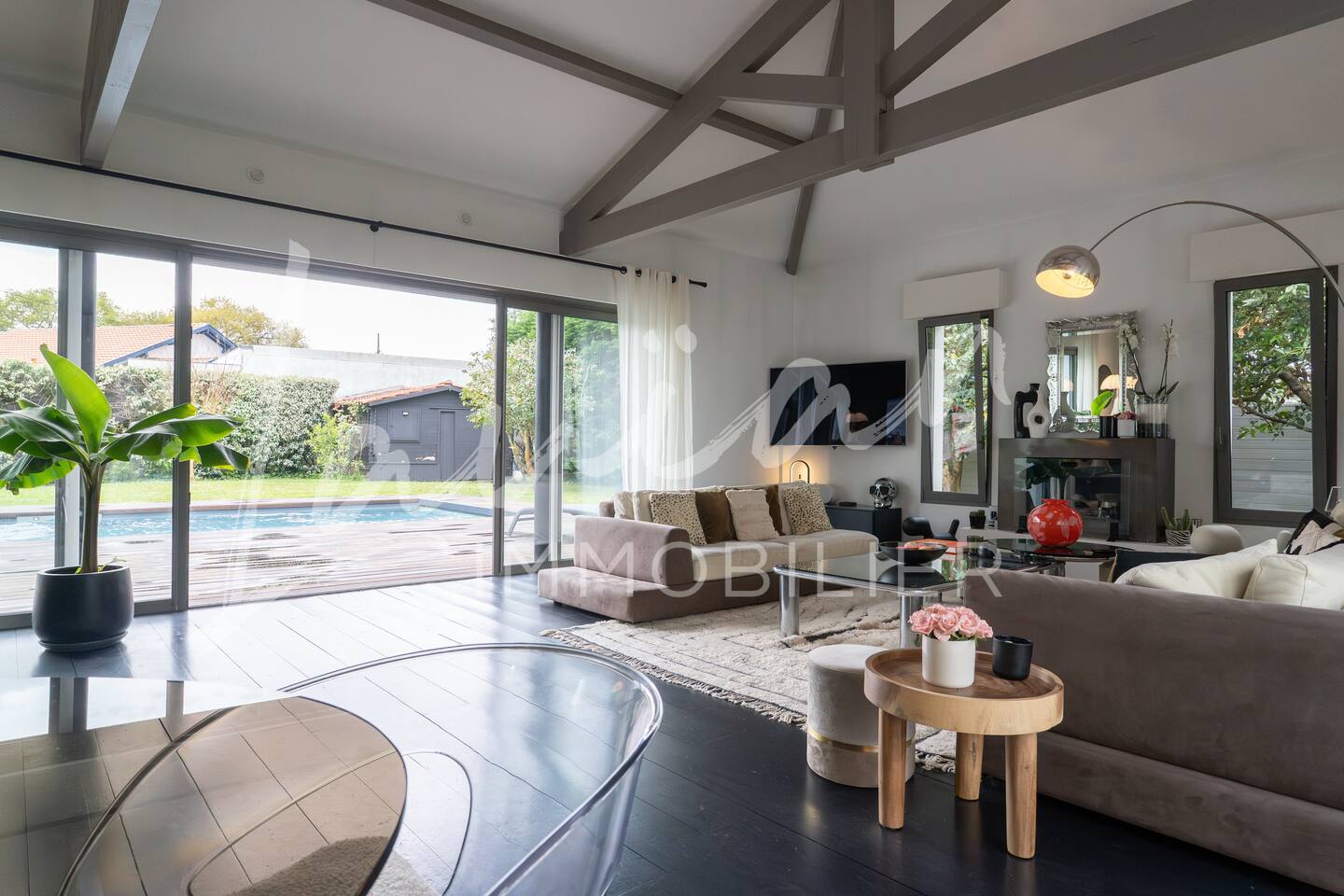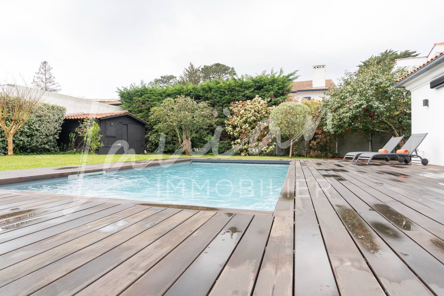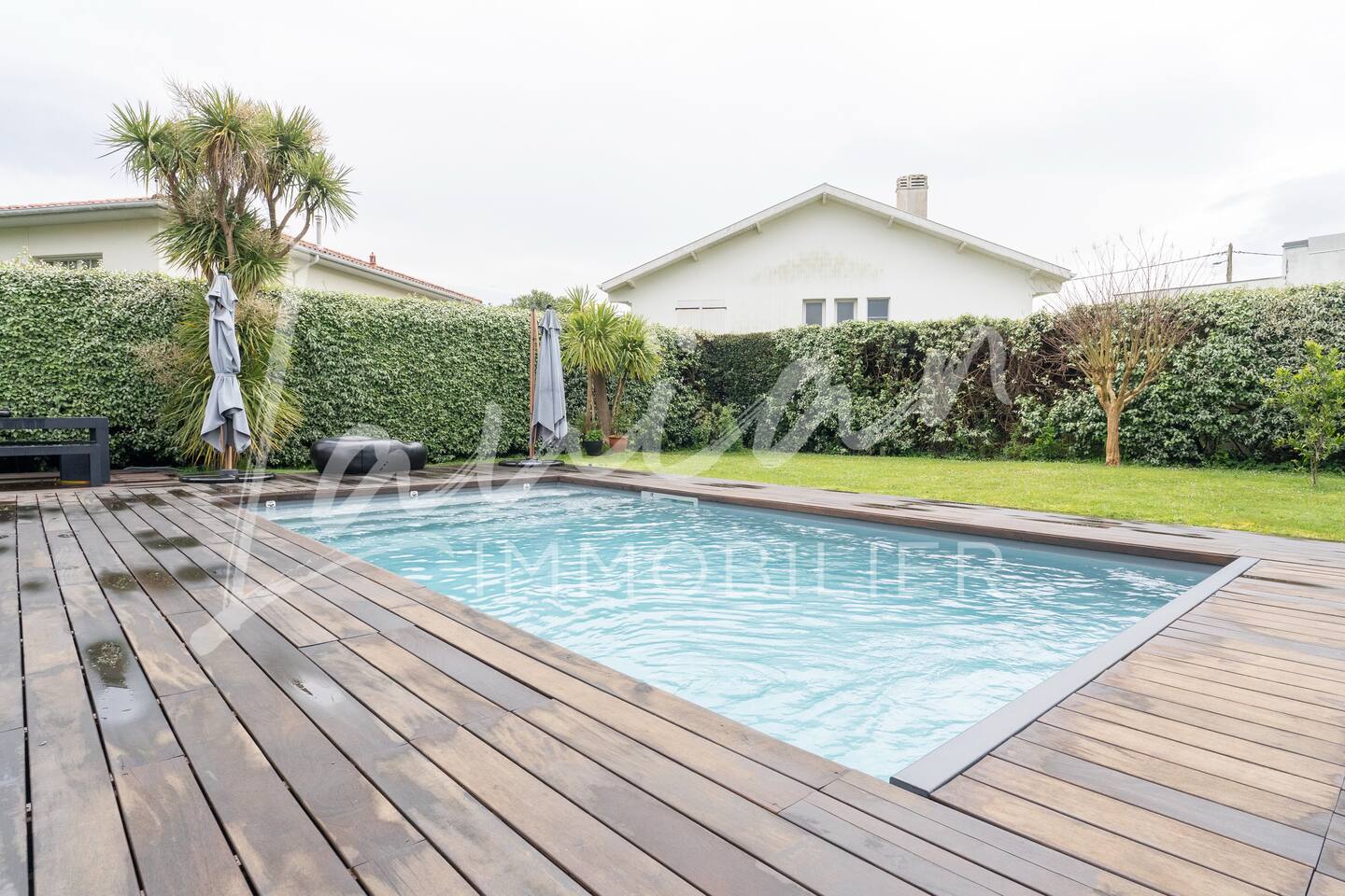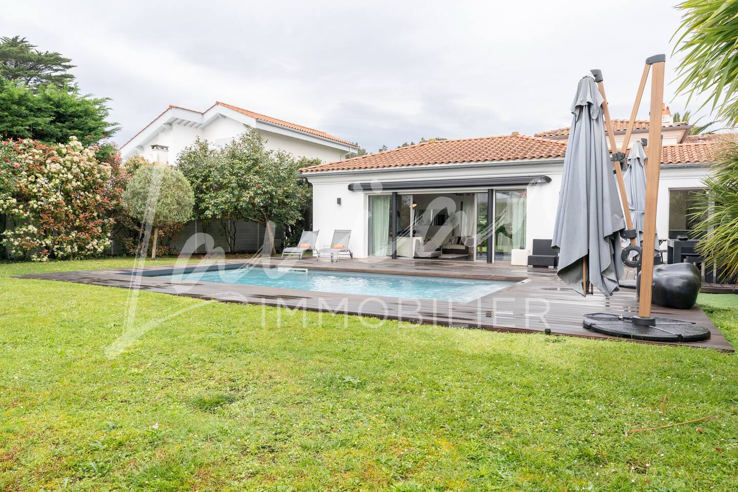 Rénovée avec goût, cette villa des années 60 allie avec brio l’élégance contemporaine et le charme des années 30. De vastes terrasses en bois entourent la maison, offrant plusieurs espaces de détente au soleil tout au long de la journée. Un magnifique jardin paysager, sublimé par des hortensias multicolores, entoure une piscine chauffée avec une large plage en deck blond et une cuisine d’été, parfaits pour des moments de convivialité en plein air. Un intérieur lumineux et raffiné Dès l’entrée, le ton est donné avec de superbes carreaux de ciment d’origine, témoins du caractère unique de la maison. La villa s’ouvre sur une spacieuse pièce de vie, où chaque détail a été pensé pour le confort et la convivialité : • Un vaste séjour traversant, baigné de lumière grâce aux baies vitrées à galandage, prolongeant l’espace vers les terrasses extérieures. • Une cuisine ultra-moderne, avec un îlot central design, entièrement équipée et ouverte sur la piscine et le jardin. • Une salle à manger et un bar, donnant sur une terrasse plein ouest, idéale pour savourer un verre en soirée. Des espaces de nuit apaisants et confortables La villa dispose de quatre chambres, toutes aménagées avec soin pour offrir calme et intimité : • Suite parentale avec une superbe vue sur le Golf, parquet blanc, lit king-size, TV, et une impressionnante salle d’eau en béton ciré clair, avec deux douches indépendantes et une séparation originale entre les vasques et la douche. • Deux chambres doubles, dont une avec balcon et vue sur le Golf, partageant une salle d’eau avec douche à l’italienne. • Une quatrième chambre, située côté jardin, avec son propre coin bureau et une salle de bains privative avec toilettes. Prestations haut de gamme pour un séjour inoubliable • Piscine chauffée et entretenue chaque semaine. • Linge de maison fourni et ménage hebdomadaire offert. • Vaisselle de famille et argenterie à disposition pour une touche d’élégance supplémentaire. • Grande buanderie avec lave-linge et sèche-linge. Idéale pour des vacances au calme, cette villa offre un cadre exclusif tout en étant à proximité immédiate des Halles des 5 Cantons, des plages d’Anglet et du Golf du Phare.