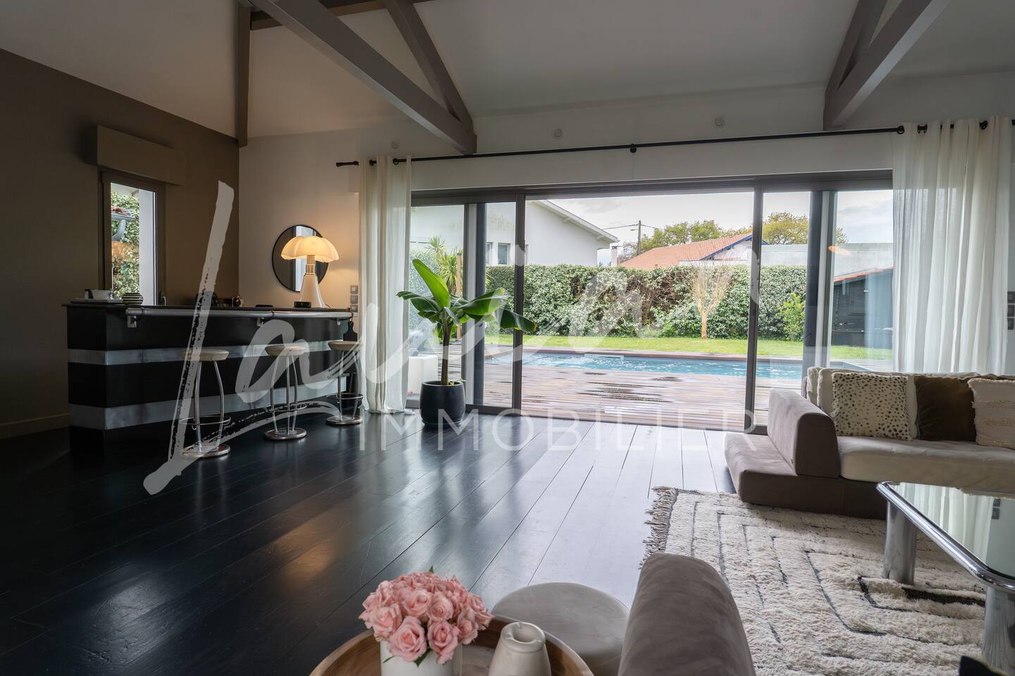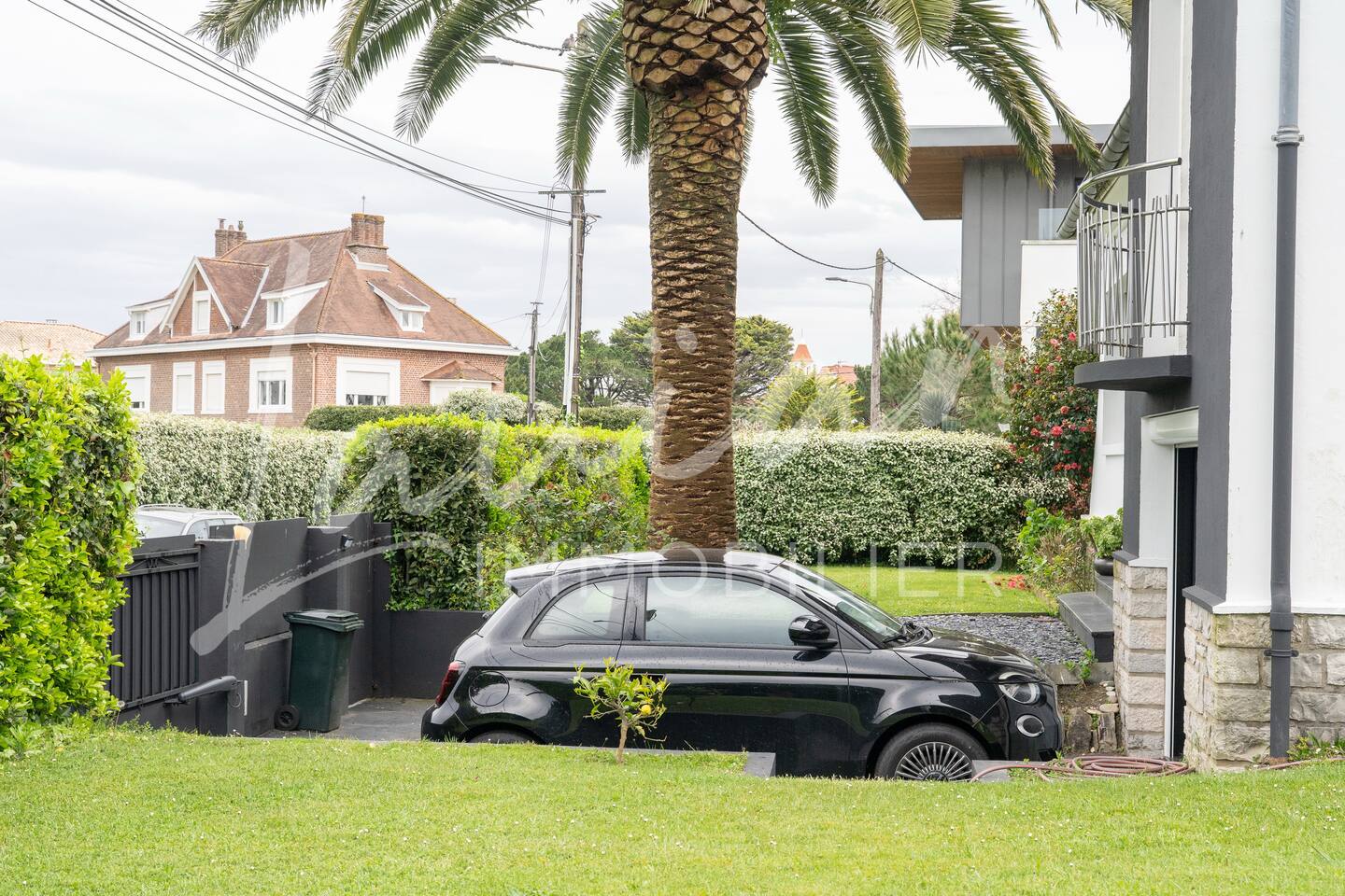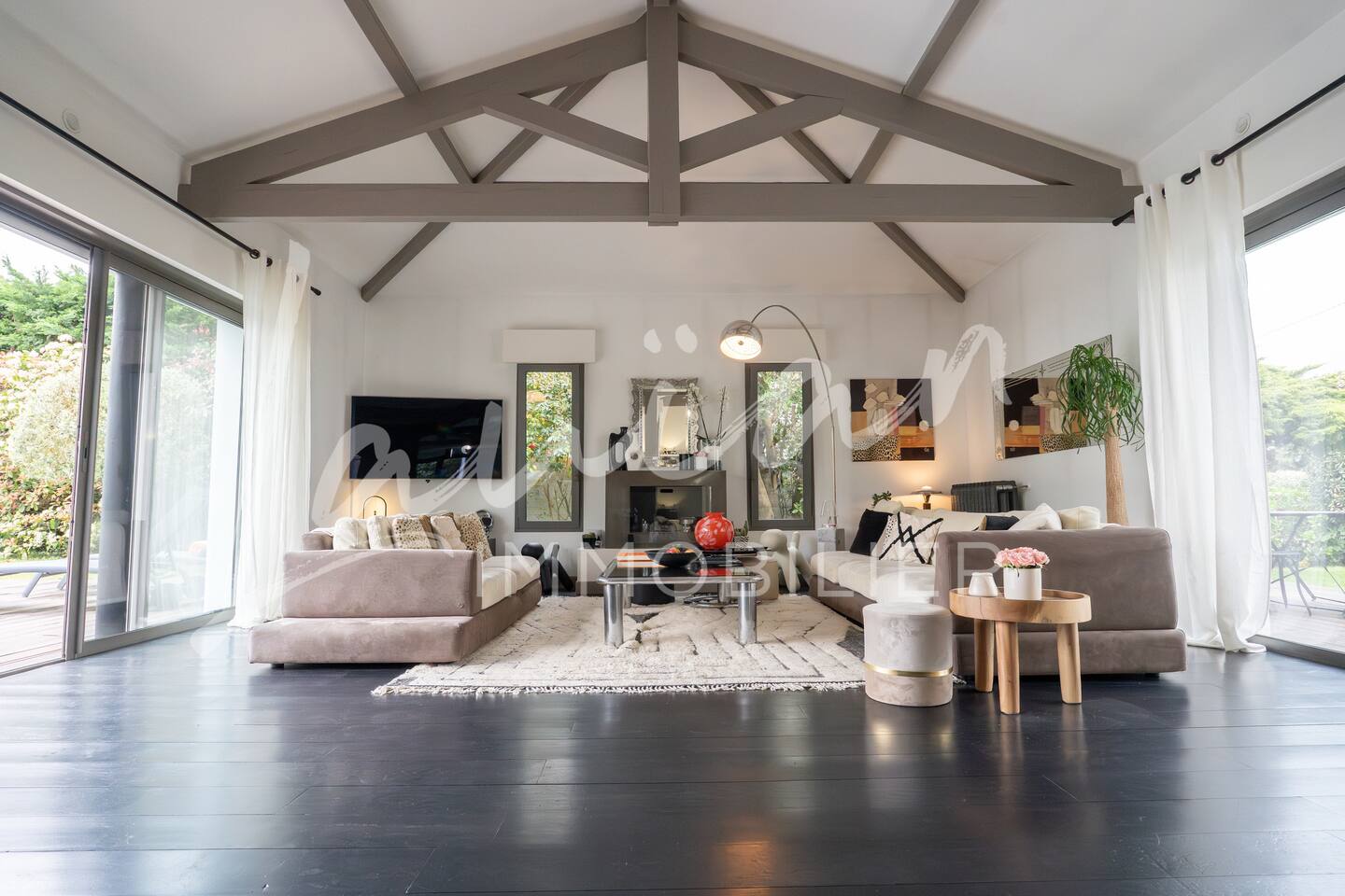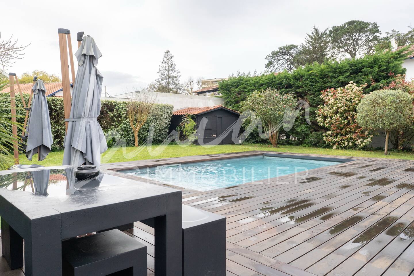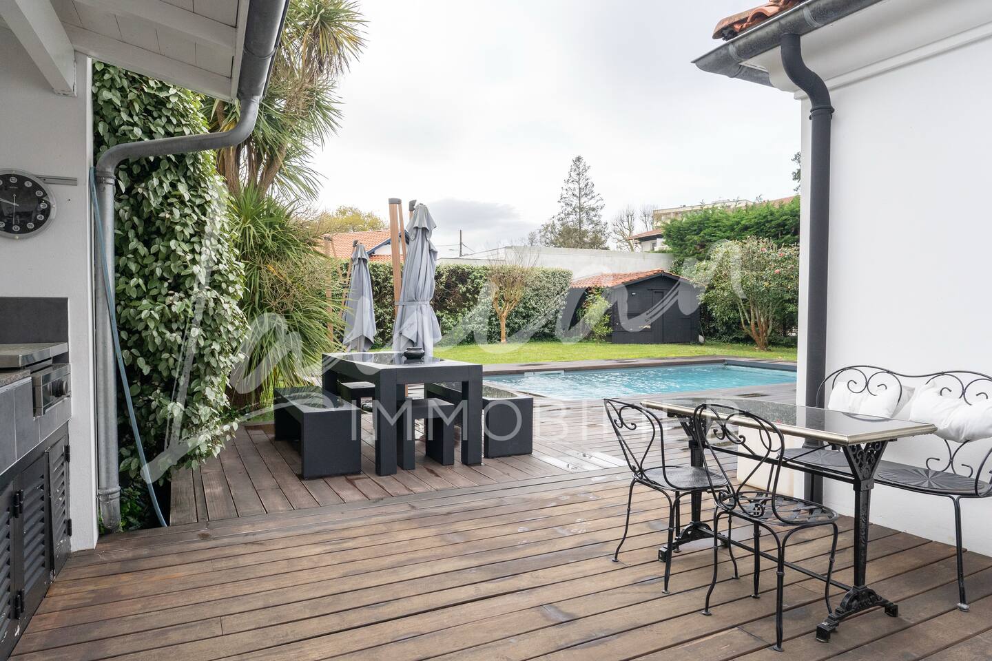 Rénovée avec goût, cette villa des années 60 allie avec brio l’élégance contemporaine et le charme des années 30. De vastes terrasses en bois entourent la maison, offrant plusieurs espaces de détente au soleil tout au long de la journée. Un magnifique jardin paysager, sublimé par des hortensias multicolores, entoure une piscine chauffée avec une large plage en deck blond et une cuisine d’été, parfaits pour des moments de convivialité en plein air. Un intérieur lumineux et raffiné Dès l’entrée, le ton est donné avec de superbes carreaux de ciment d’origine, témoins du caractère unique de la maison. La villa s’ouvre sur une spacieuse pièce de vie, où chaque détail a été pensé pour le confort et la convivialité : • Un vaste séjour traversant, baigné de lumière grâce aux baies vitrées à galandage, prolongeant l’espace vers les terrasses extérieures. • Une cuisine ultra-moderne, avec un îlot central design, entièrement équipée et ouverte sur la piscine et le jardin. • Une salle à manger et un bar, donnant sur une terrasse plein ouest, idéale pour savourer un verre en soirée. Des espaces de nuit apaisants et confortables La villa dispose de quatre chambres, toutes aménagées avec soin pour offrir calme et intimité : • Suite parentale avec une superbe vue sur le Golf, parquet blanc, lit king-size, TV, et une impressionnante salle d’eau en béton ciré clair, avec deux douches indépendantes et une séparation originale entre les vasques et la douche. • Deux chambres doubles, dont une avec balcon et vue sur le Golf, partageant une salle d’eau avec douche à l’italienne. • Une quatrième chambre, située côté jardin, avec son propre coin bureau et une salle de bains privative avec toilettes. Prestations haut de gamme pour un séjour inoubliable • Piscine chauffée et entretenue chaque semaine. • Linge de maison fourni et ménage hebdomadaire offert. • Vaisselle de famille et argenterie à disposition pour une touche d’élégance supplémentaire. • Grande buanderie avec lave-linge et sèche-linge. Idéale pour des vacances au calme, cette villa offre un cadre exclusif tout en étant à proximité immédiate des Halles des 5 Cantons, des plages d’Anglet et du Golf du Phare.