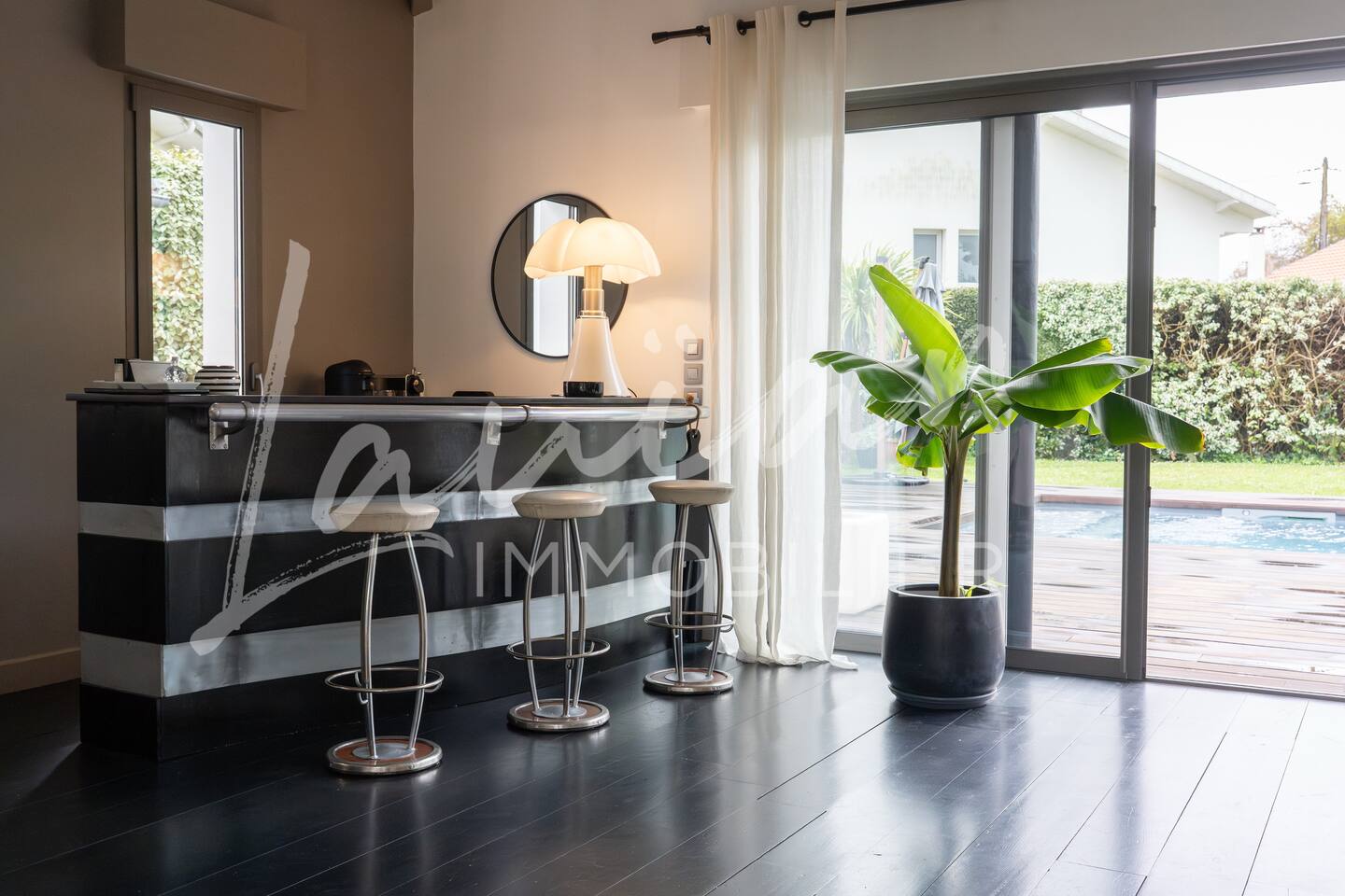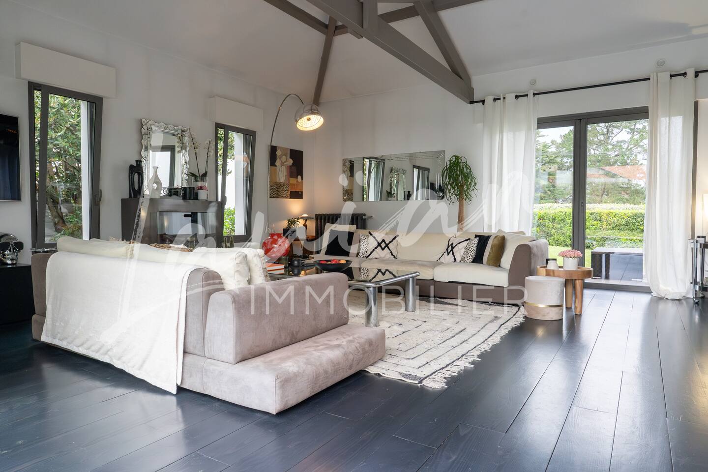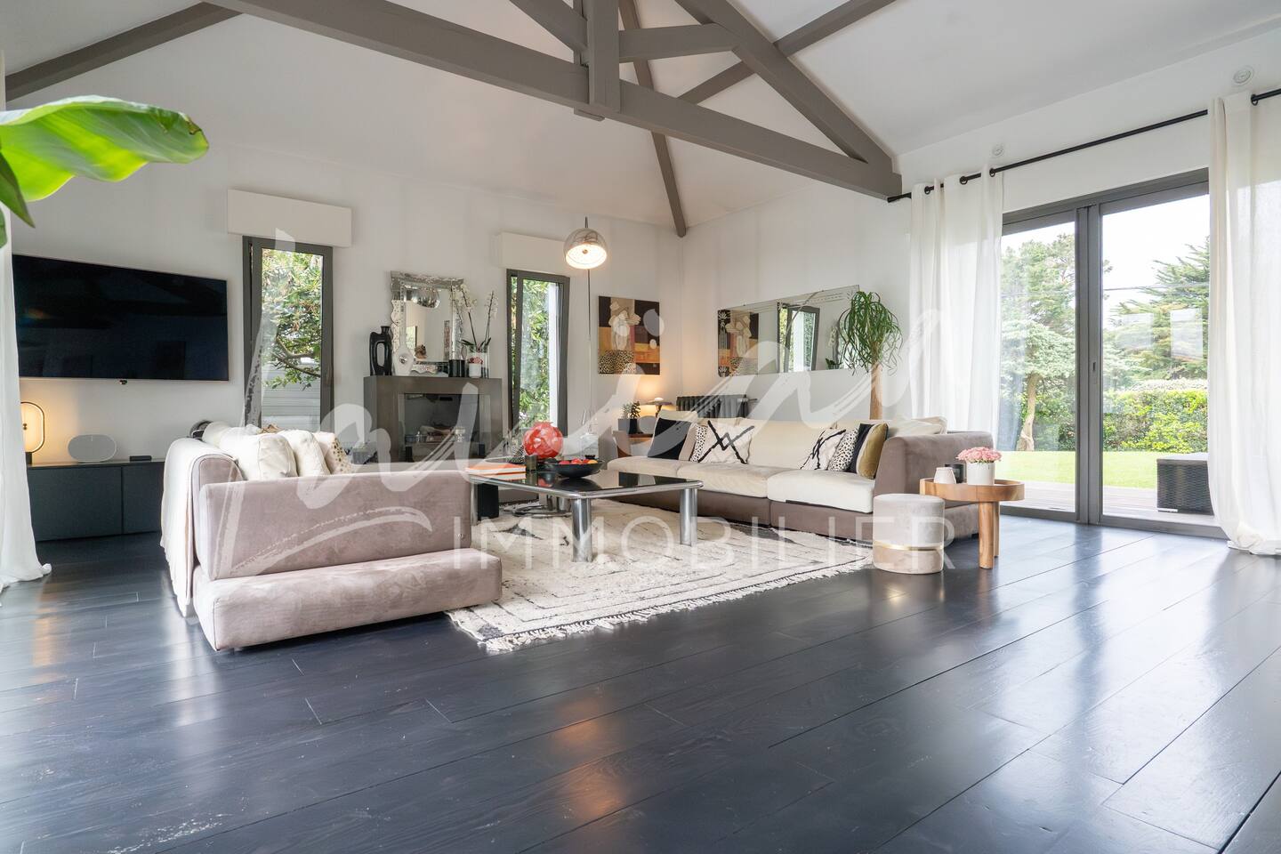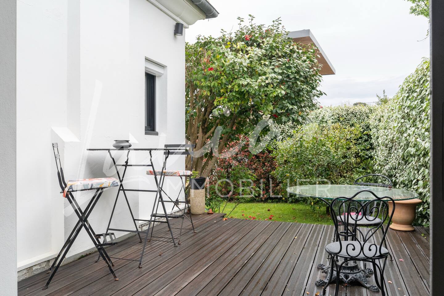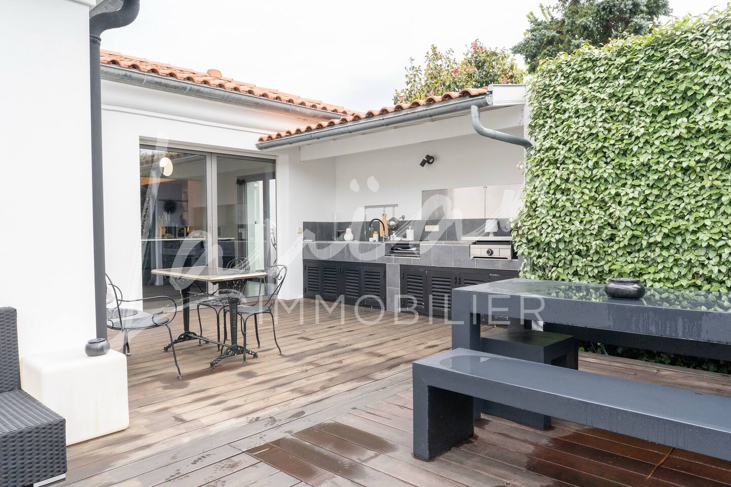 Rénovée avec goût, cette villa des années 60 allie avec brio l’élégance contemporaine et le charme des années 30. De vastes terrasses en bois entourent la maison, offrant plusieurs espaces de détente au soleil tout au long de la journée. Un magnifique jardin paysager, sublimé par des hortensias multicolores, entoure une piscine chauffée avec une large plage en deck blond et une cuisine d’été, parfaits pour des moments de convivialité en plein air. Un intérieur lumineux et raffiné Dès l’entrée, le ton est donné avec de superbes carreaux de ciment d’origine, témoins du caractère unique de la maison. La villa s’ouvre sur une spacieuse pièce de vie, où chaque détail a été pensé pour le confort et la convivialité : • Un vaste séjour traversant, baigné de lumière grâce aux baies vitrées à galandage, prolongeant l’espace vers les terrasses extérieures. • Une cuisine ultra-moderne, avec un îlot central design, entièrement équipée et ouverte sur la piscine et le jardin. • Une salle à manger et un bar, donnant sur une terrasse plein ouest, idéale pour savourer un verre en soirée. Des espaces de nuit apaisants et confortables La villa dispose de quatre chambres, toutes aménagées avec soin pour offrir calme et intimité : • Suite parentale avec une superbe vue sur le Golf, parquet blanc, lit king-size, TV, et une impressionnante salle d’eau en béton ciré clair, avec deux douches indépendantes et une séparation originale entre les vasques et la douche. • Deux chambres doubles, dont une avec balcon et vue sur le Golf, partageant une salle d’eau avec douche à l’italienne. • Une quatrième chambre, située côté jardin, avec son propre coin bureau et une salle de bains privative avec toilettes. Prestations haut de gamme pour un séjour inoubliable • Piscine chauffée et entretenue chaque semaine. • Linge de maison fourni et ménage hebdomadaire offert. • Vaisselle de famille et argenterie à disposition pour une touche d’élégance supplémentaire. • Grande buanderie avec lave-linge et sèche-linge. Idéale pour des vacances au calme, cette villa offre un cadre exclusif tout en étant à proximité immédiate des Halles des 5 Cantons, des plages d’Anglet et du Golf du Phare.