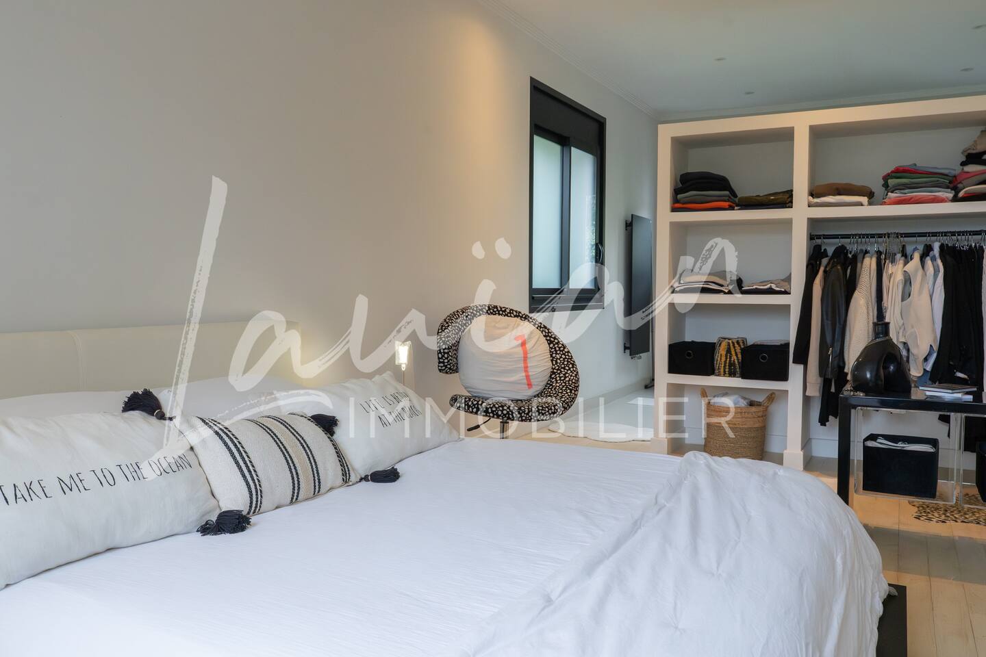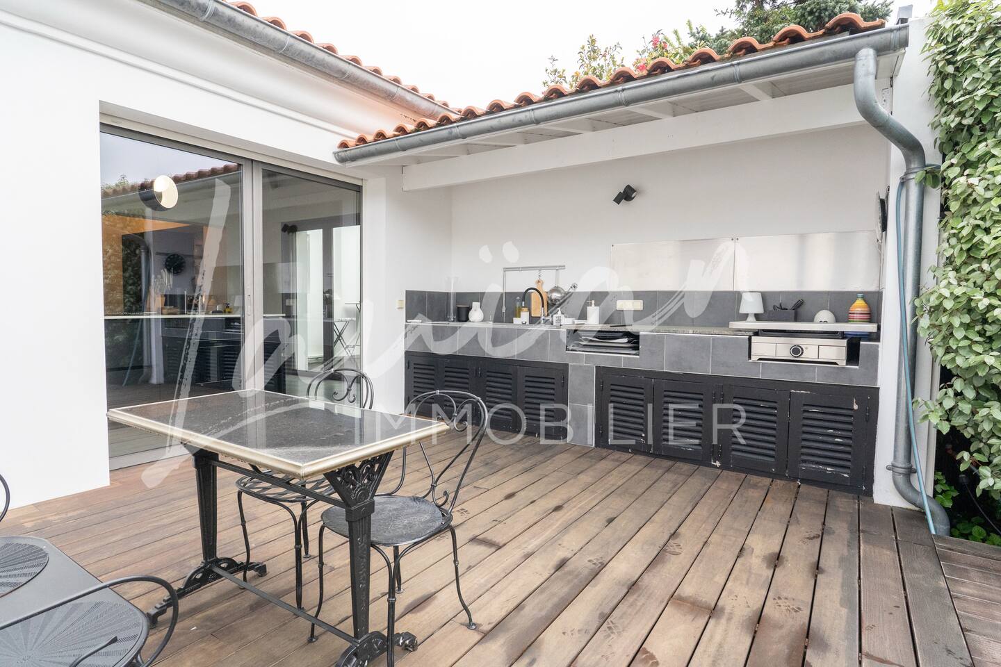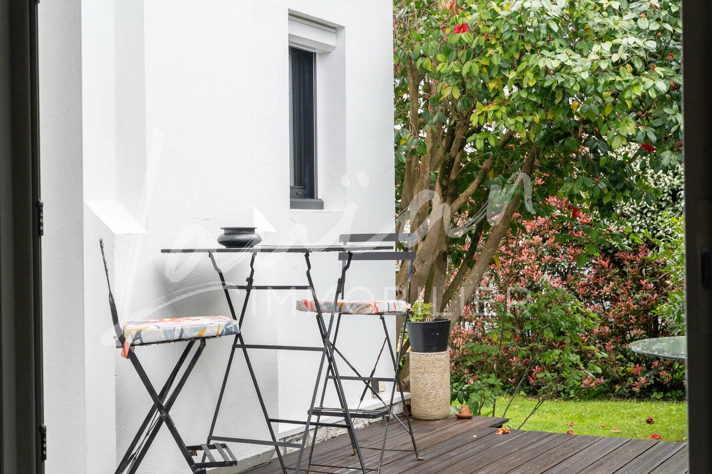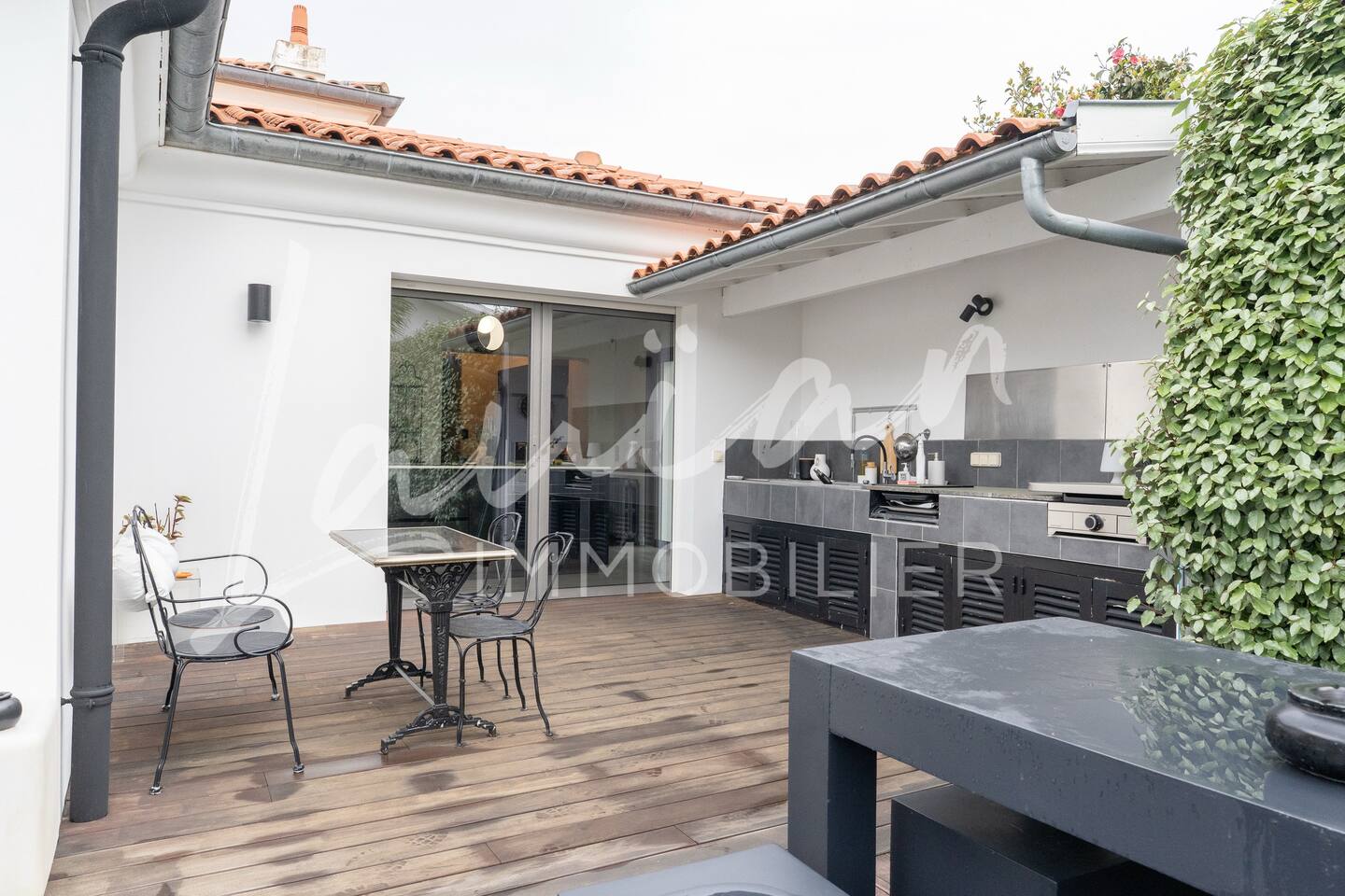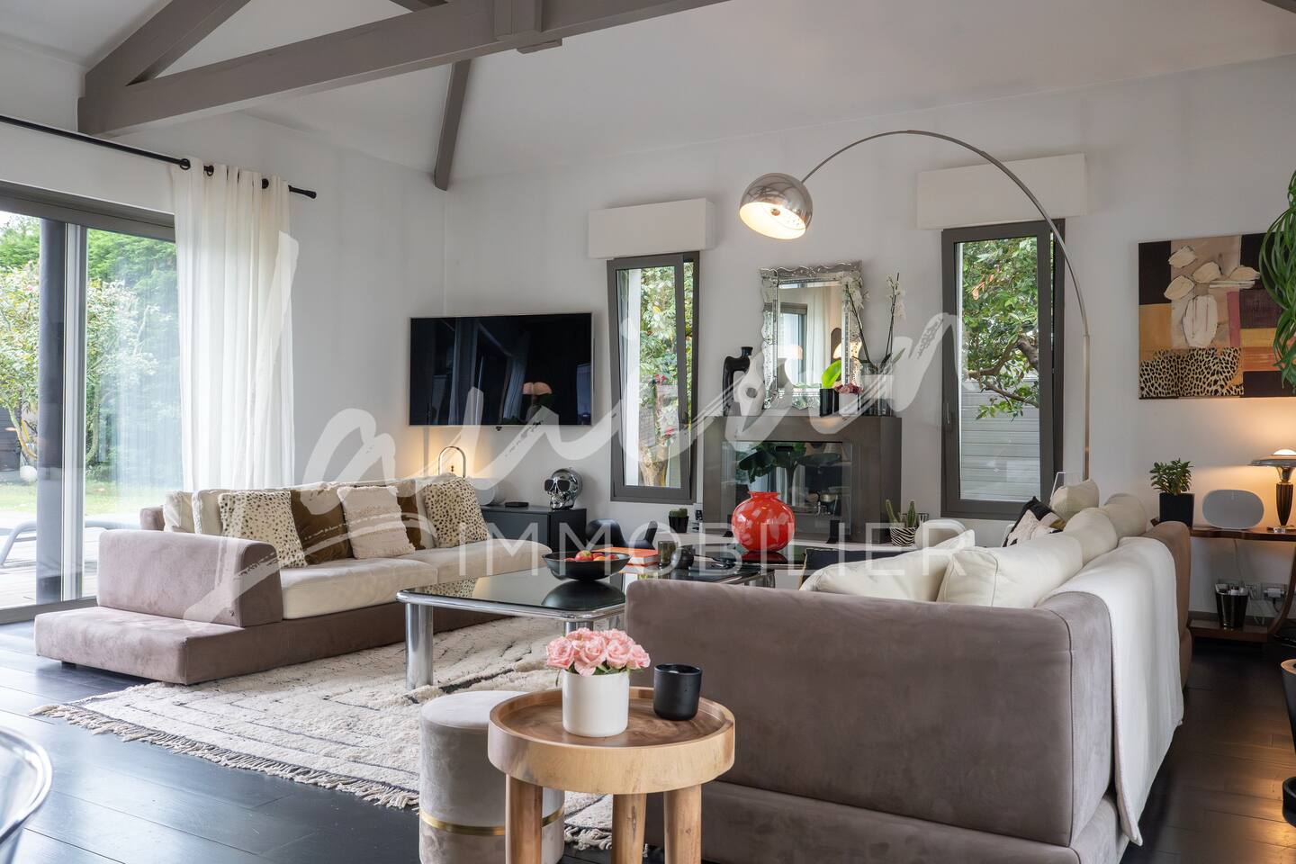 Rénovée avec goût, cette villa des années 60 allie avec brio l’élégance contemporaine et le charme des années 30. De vastes terrasses en bois entourent la maison, offrant plusieurs espaces de détente au soleil tout au long de la journée. Un magnifique jardin paysager, sublimé par des hortensias multicolores, entoure une piscine chauffée avec une large plage en deck blond et une cuisine d’été, parfaits pour des moments de convivialité en plein air. Un intérieur lumineux et raffiné Dès l’entrée, le ton est donné avec de superbes carreaux de ciment d’origine, témoins du caractère unique de la maison. La villa s’ouvre sur une spacieuse pièce de vie, où chaque détail a été pensé pour le confort et la convivialité : • Un vaste séjour traversant, baigné de lumière grâce aux baies vitrées à galandage, prolongeant l’espace vers les terrasses extérieures. • Une cuisine ultra-moderne, avec un îlot central design, entièrement équipée et ouverte sur la piscine et le jardin. • Une salle à manger et un bar, donnant sur une terrasse plein ouest, idéale pour savourer un verre en soirée. Des espaces de nuit apaisants et confortables La villa dispose de quatre chambres, toutes aménagées avec soin pour offrir calme et intimité : • Suite parentale avec une superbe vue sur le Golf, parquet blanc, lit king-size, TV, et une impressionnante salle d’eau en béton ciré clair, avec deux douches indépendantes et une séparation originale entre les vasques et la douche. • Deux chambres doubles, dont une avec balcon et vue sur le Golf, partageant une salle d’eau avec douche à l’italienne. • Une quatrième chambre, située côté jardin, avec son propre coin bureau et une salle de bains privative avec toilettes. Prestations haut de gamme pour un séjour inoubliable • Piscine chauffée et entretenue chaque semaine. • Linge de maison fourni et ménage hebdomadaire offert. • Vaisselle de famille et argenterie à disposition pour une touche d’élégance supplémentaire. • Grande buanderie avec lave-linge et sèche-linge. Idéale pour des vacances au calme, cette villa offre un cadre exclusif tout en étant à proximité immédiate des Halles des 5 Cantons, des plages d’Anglet et du Golf du Phare.