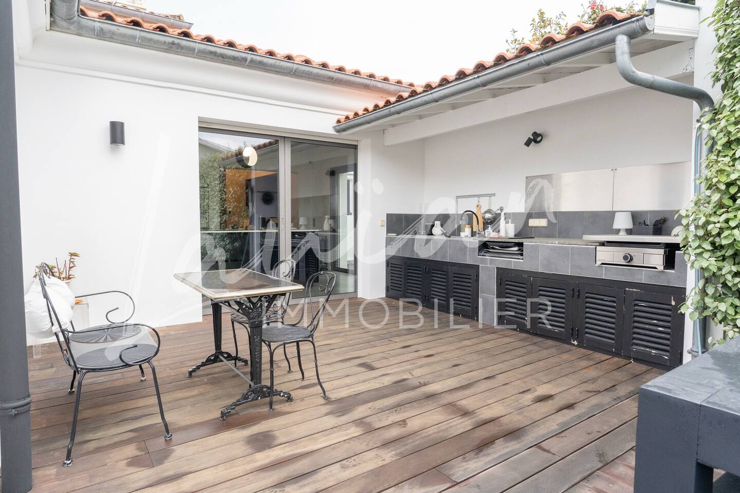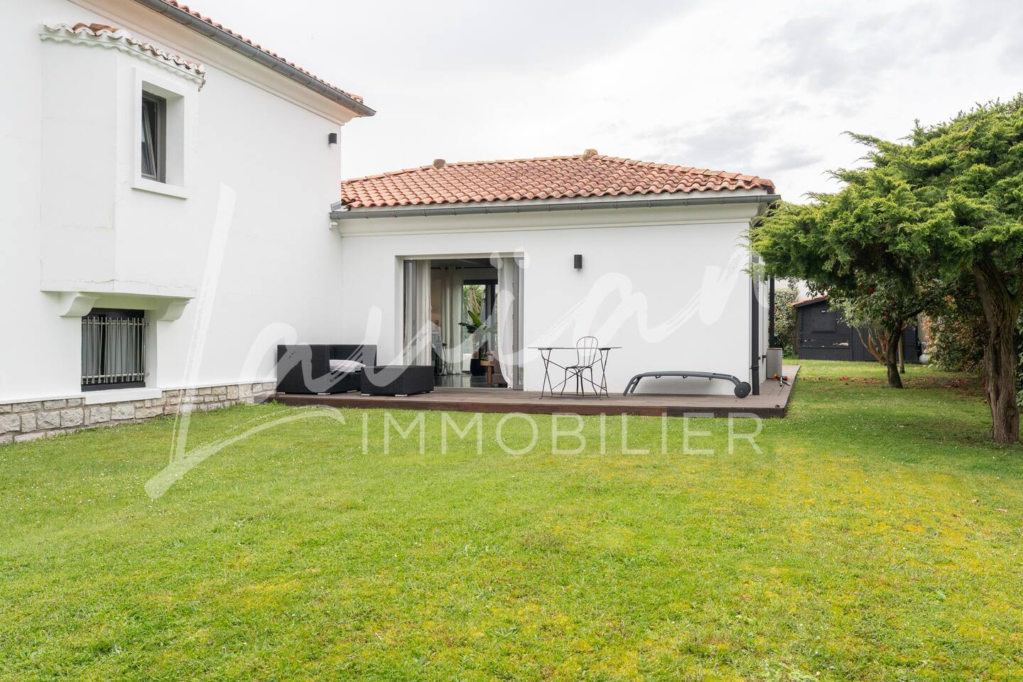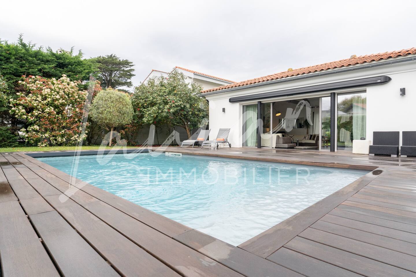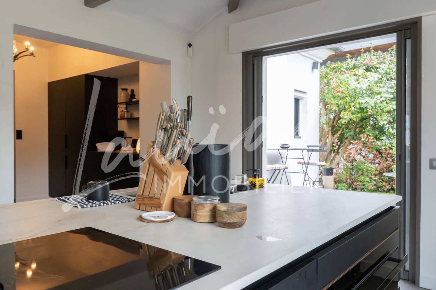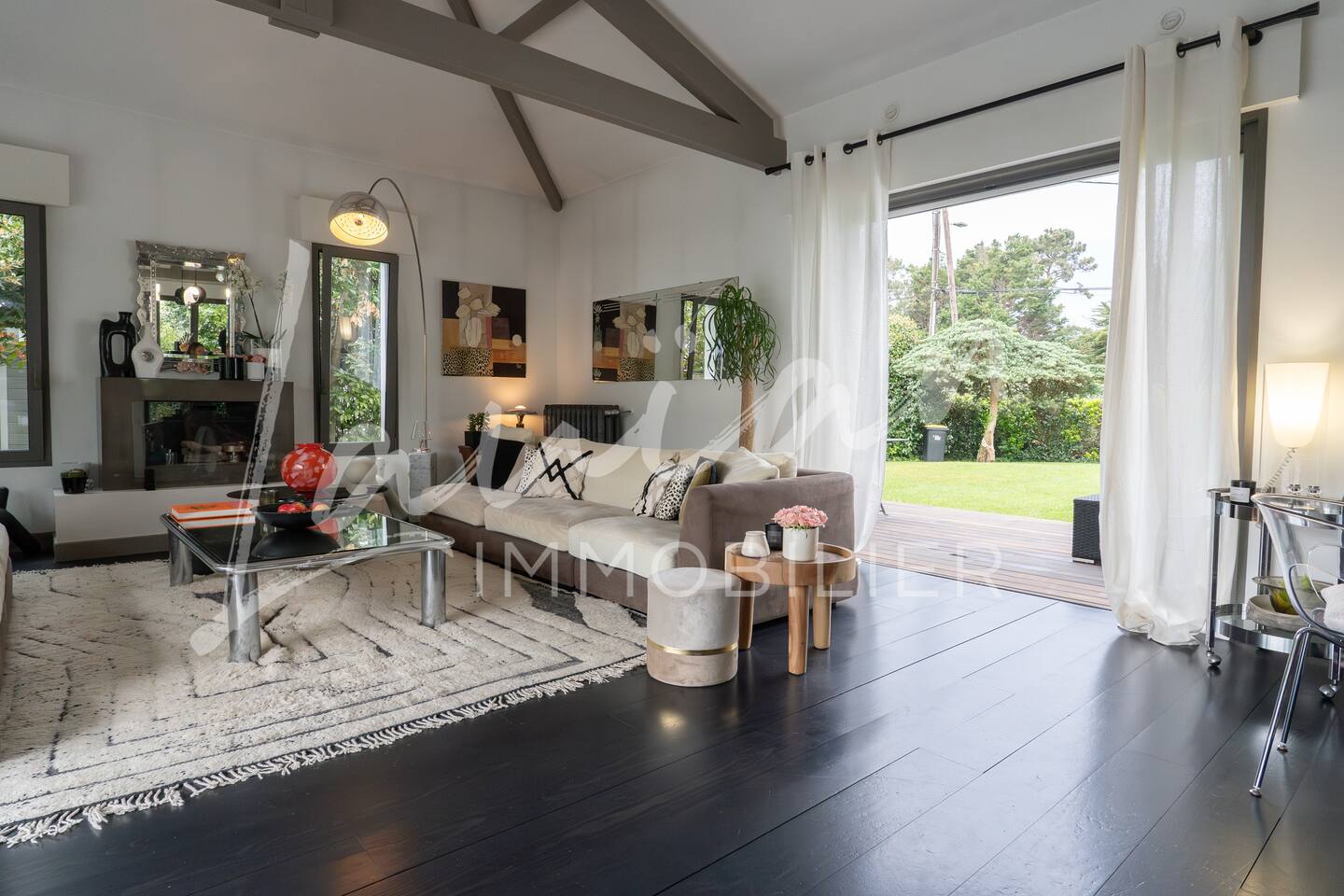 Rénovée avec goût, cette villa des années 60 allie avec brio l’élégance contemporaine et le charme des années 30. De vastes terrasses en bois entourent la maison, offrant plusieurs espaces de détente au soleil tout au long de la journée. Un magnifique jardin paysager, sublimé par des hortensias multicolores, entoure une piscine chauffée avec une large plage en deck blond et une cuisine d’été, parfaits pour des moments de convivialité en plein air. Un intérieur lumineux et raffiné Dès l’entrée, le ton est donné avec de superbes carreaux de ciment d’origine, témoins du caractère unique de la maison. La villa s’ouvre sur une spacieuse pièce de vie, où chaque détail a été pensé pour le confort et la convivialité : • Un vaste séjour traversant, baigné de lumière grâce aux baies vitrées à galandage, prolongeant l’espace vers les terrasses extérieures. • Une cuisine ultra-moderne, avec un îlot central design, entièrement équipée et ouverte sur la piscine et le jardin. • Une salle à manger et un bar, donnant sur une terrasse plein ouest, idéale pour savourer un verre en soirée. Des espaces de nuit apaisants et confortables La villa dispose de quatre chambres, toutes aménagées avec soin pour offrir calme et intimité : • Suite parentale avec une superbe vue sur le Golf, parquet blanc, lit king-size, TV, et une impressionnante salle d’eau en béton ciré clair, avec deux douches indépendantes et une séparation originale entre les vasques et la douche. • Deux chambres doubles, dont une avec balcon et vue sur le Golf, partageant une salle d’eau avec douche à l’italienne. • Une quatrième chambre, située côté jardin, avec son propre coin bureau et une salle de bains privative avec toilettes. Prestations haut de gamme pour un séjour inoubliable • Piscine chauffée et entretenue chaque semaine. • Linge de maison fourni et ménage hebdomadaire offert. • Vaisselle de famille et argenterie à disposition pour une touche d’élégance supplémentaire. • Grande buanderie avec lave-linge et sèche-linge. Idéale pour des vacances au calme, cette villa offre un cadre exclusif tout en étant à proximité immédiate des Halles des 5 Cantons, des plages d’Anglet et du Golf du Phare.