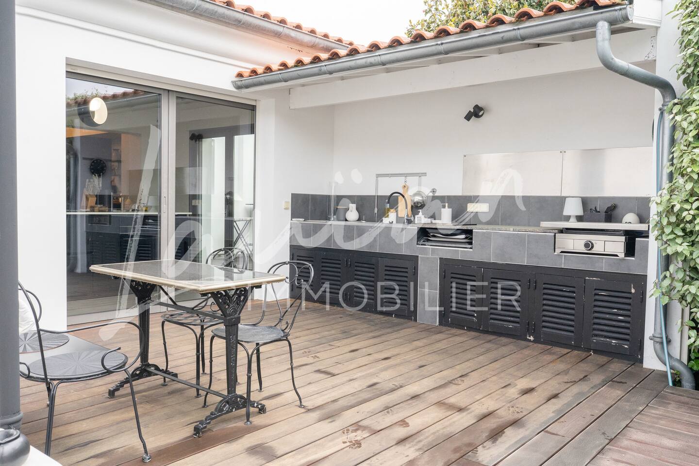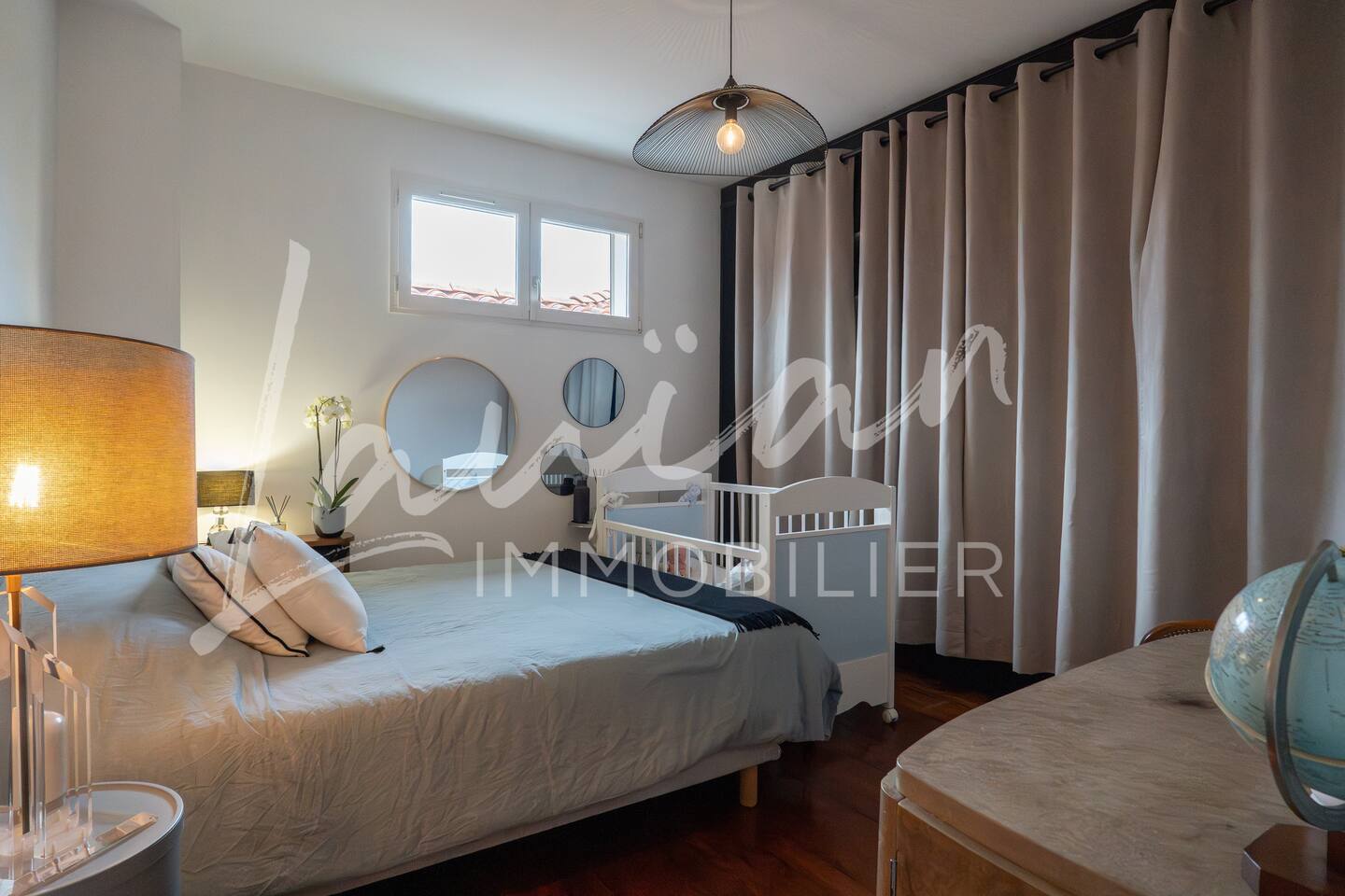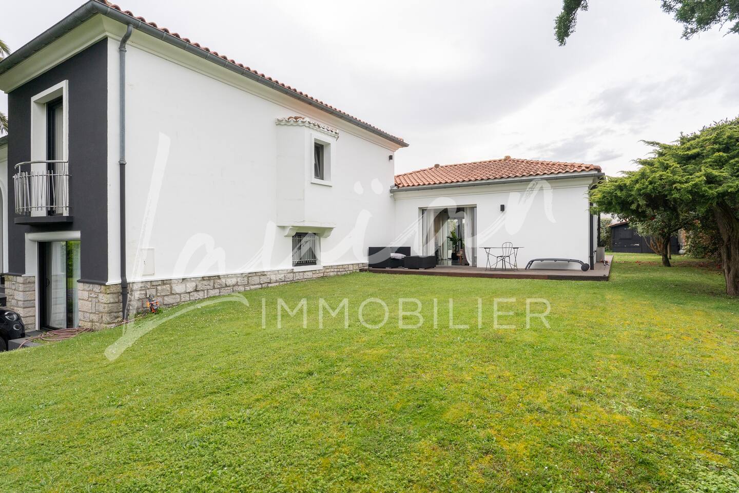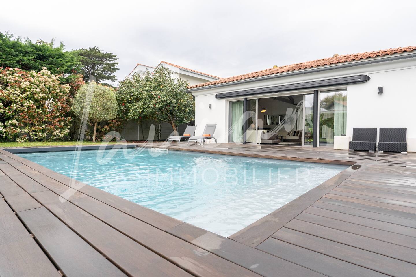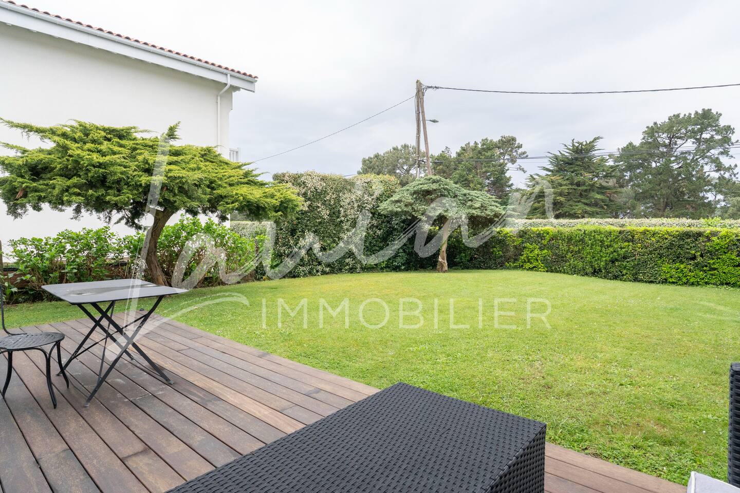 Rénovée avec goût, cette villa des années 60 allie avec brio l’élégance contemporaine et le charme des années 30. De vastes terrasses en bois entourent la maison, offrant plusieurs espaces de détente au soleil tout au long de la journée. Un magnifique jardin paysager, sublimé par des hortensias multicolores, entoure une piscine chauffée avec une large plage en deck blond et une cuisine d’été, parfaits pour des moments de convivialité en plein air. Un intérieur lumineux et raffiné Dès l’entrée, le ton est donné avec de superbes carreaux de ciment d’origine, témoins du caractère unique de la maison. La villa s’ouvre sur une spacieuse pièce de vie, où chaque détail a été pensé pour le confort et la convivialité : • Un vaste séjour traversant, baigné de lumière grâce aux baies vitrées à galandage, prolongeant l’espace vers les terrasses extérieures. • Une cuisine ultra-moderne, avec un îlot central design, entièrement équipée et ouverte sur la piscine et le jardin. • Une salle à manger et un bar, donnant sur une terrasse plein ouest, idéale pour savourer un verre en soirée. Des espaces de nuit apaisants et confortables La villa dispose de quatre chambres, toutes aménagées avec soin pour offrir calme et intimité : • Suite parentale avec une superbe vue sur le Golf, parquet blanc, lit king-size, TV, et une impressionnante salle d’eau en béton ciré clair, avec deux douches indépendantes et une séparation originale entre les vasques et la douche. • Deux chambres doubles, dont une avec balcon et vue sur le Golf, partageant une salle d’eau avec douche à l’italienne. • Une quatrième chambre, située côté jardin, avec son propre coin bureau et une salle de bains privative avec toilettes. Prestations haut de gamme pour un séjour inoubliable • Piscine chauffée et entretenue chaque semaine. • Linge de maison fourni et ménage hebdomadaire offert. • Vaisselle de famille et argenterie à disposition pour une touche d’élégance supplémentaire. • Grande buanderie avec lave-linge et sèche-linge. Idéale pour des vacances au calme, cette villa offre un cadre exclusif tout en étant à proximité immédiate des Halles des 5 Cantons, des plages d’Anglet et du Golf du Phare.