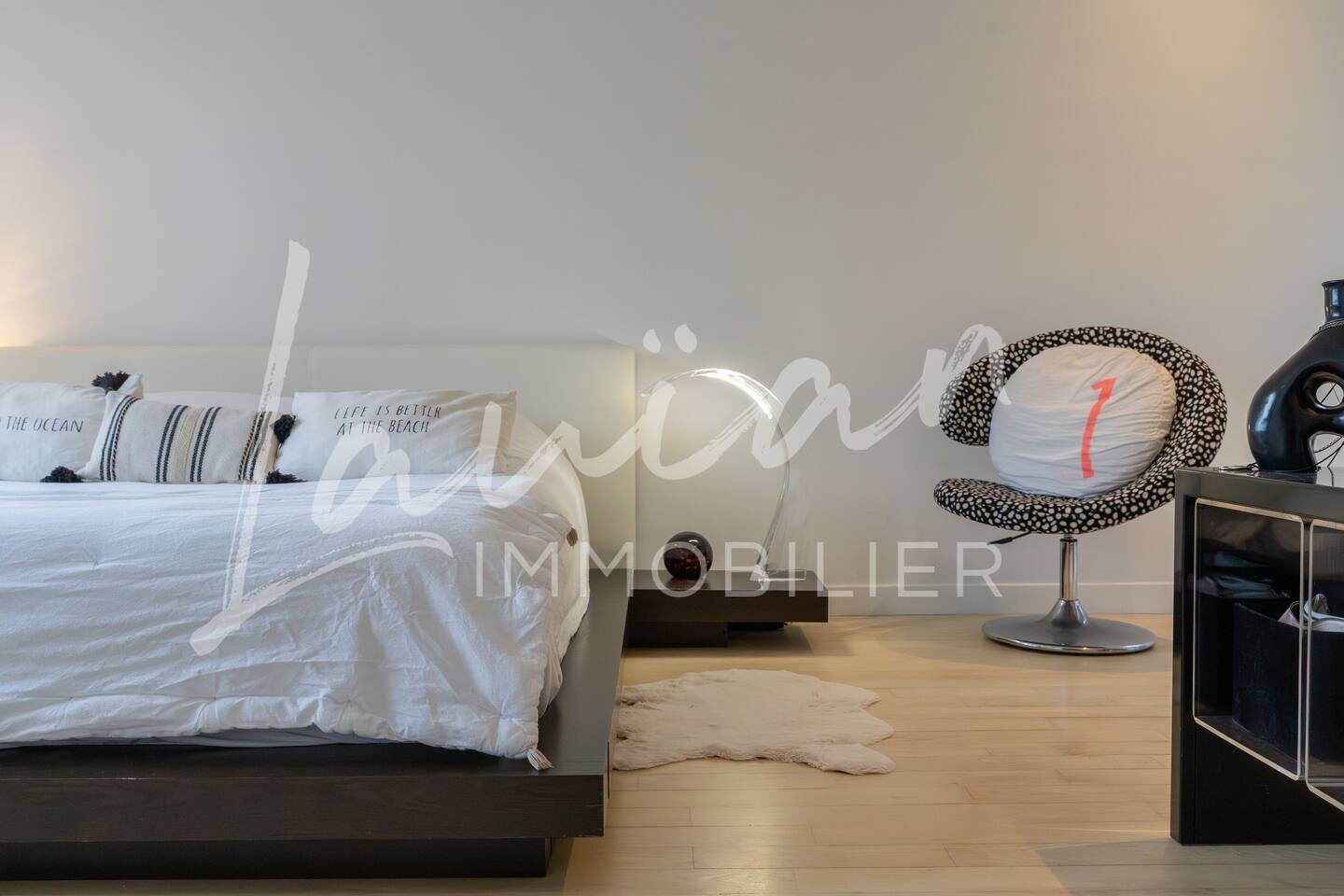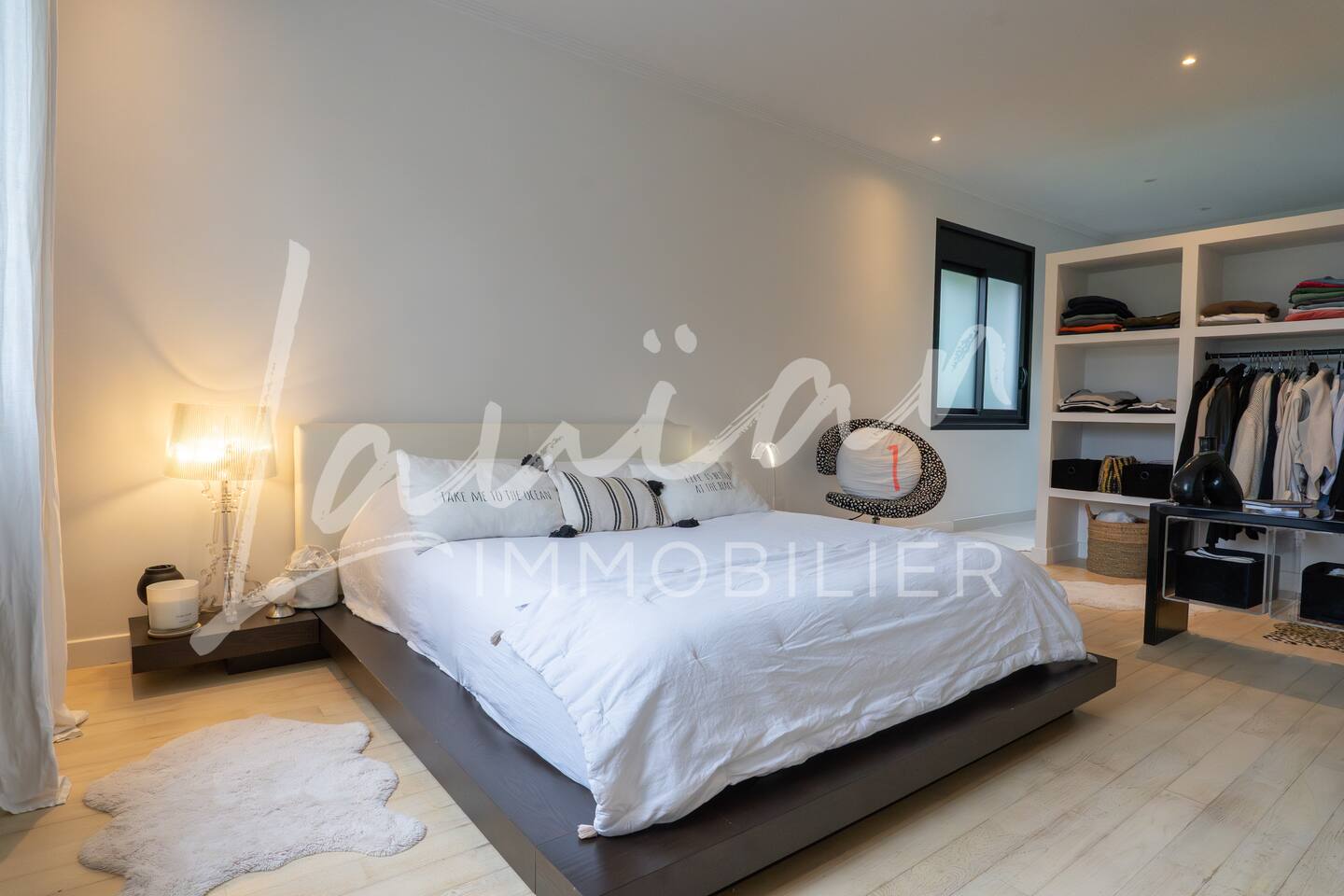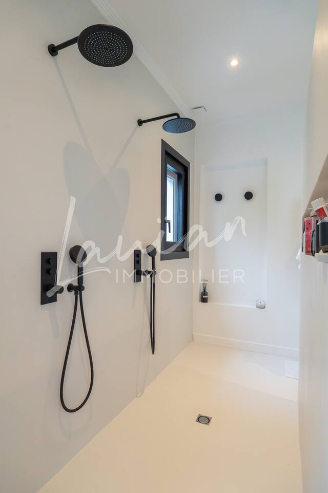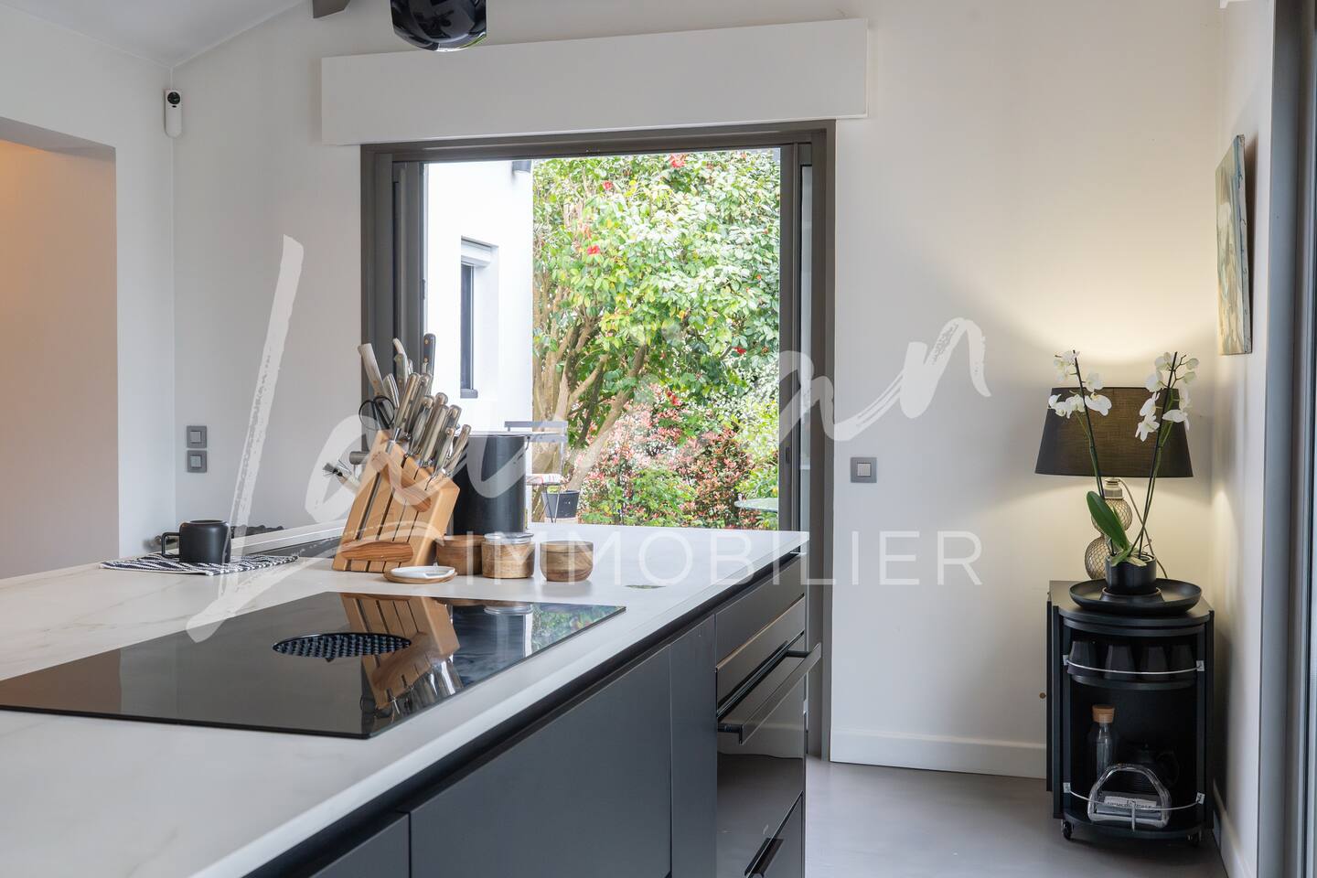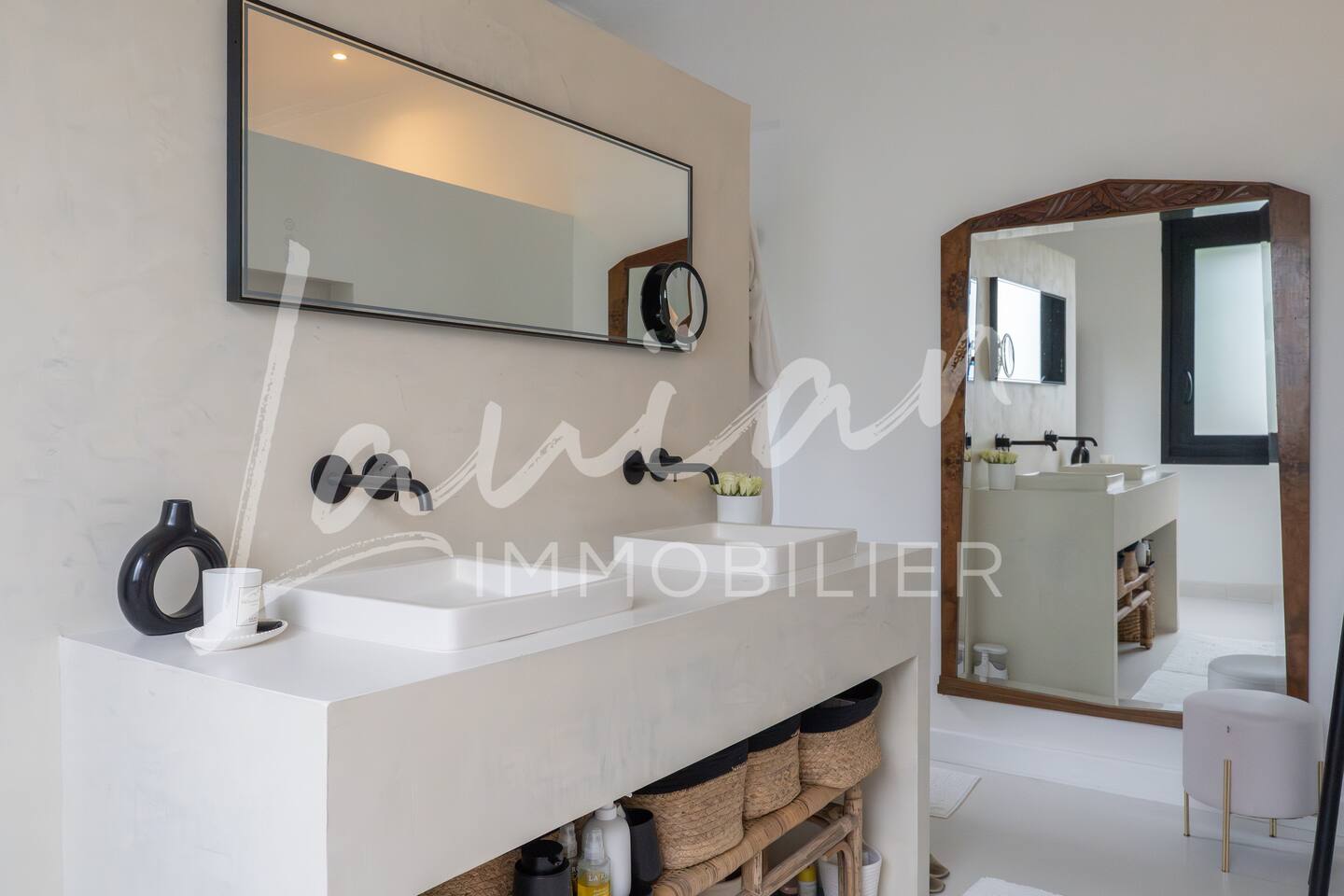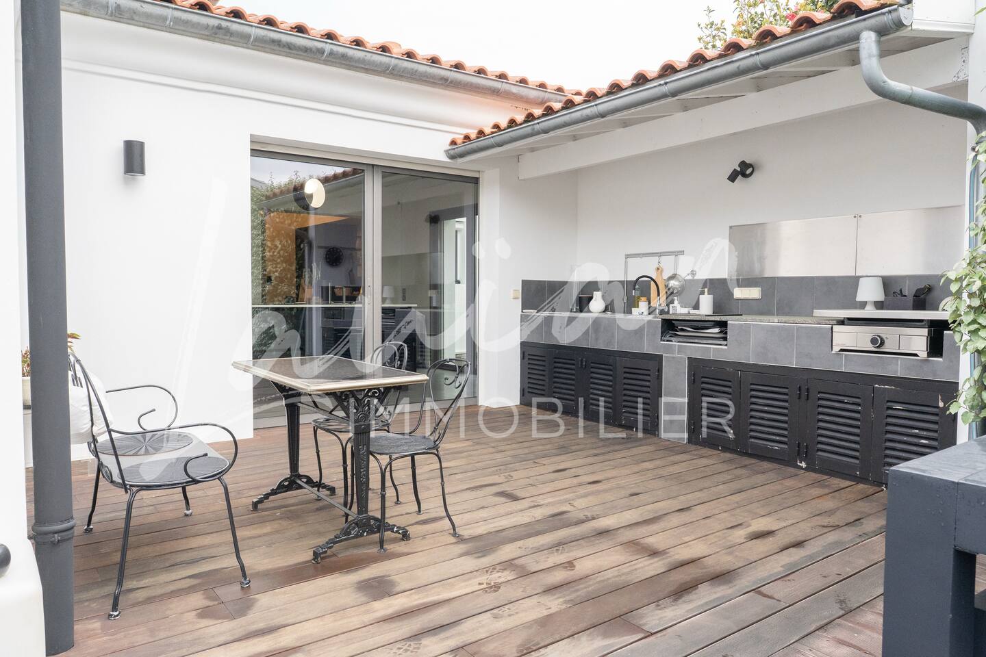Rénovée avec goût, cette villa des années 60 allie avec brio l’élégance contemporaine et le charme des années 30. De vastes terrasses en bois entourent la maison, offrant plusieurs espaces de détente au soleil tout au long de la journée. Un magnifique jardin paysager, sublimé par des hortensias multicolores, entoure une piscine chauffée avec une large plage en deck blond et une cuisine d’été, parfaits pour des moments de convivialité en plein air. Un intérieur lumineux et raffiné Dès l’entrée, le ton est donné avec de superbes carreaux de ciment d’origine, témoins du caractère unique de la maison. La villa s’ouvre sur une spacieuse pièce de vie, où chaque détail a été pensé pour le confort et la convivialité : • Un vaste séjour traversant, baigné de lumière grâce aux baies vitrées à galandage, prolongeant l’espace vers les terrasses extérieures. • Une cuisine ultra-moderne, avec un îlot central design, entièrement équipée et ouverte sur la piscine et le jardin. • Une salle à manger et un bar, donnant sur une terrasse plein ouest, idéale pour savourer un verre en soirée. Des espaces de nuit apaisants et confortables La villa dispose de quatre chambres, toutes aménagées avec soin pour offrir calme et intimité : • Suite parentale avec une superbe vue sur le Golf, parquet blanc, lit king-size, TV, et une impressionnante salle d’eau en béton ciré clair, avec deux douches indépendantes et une séparation originale entre les vasques et la douche. • Deux chambres doubles, dont une avec balcon et vue sur le Golf, partageant une salle d’eau avec douche à l’italienne. • Une quatrième chambre, située côté jardin, avec son propre coin bureau et une salle de bains privative avec toilettes. Prestations haut de gamme pour un séjour inoubliable • Piscine chauffée et entretenue chaque semaine. • Linge de maison fourni et ménage hebdomadaire offert. • Vaisselle de famille et argenterie à disposition pour une touche d’élégance supplémentaire. • Grande buanderie avec lave-linge et sèche-linge. Idéale pour des vacances au calme, cette villa offre un cadre exclusif tout en étant à proximité immédiate des Halles des 5 Cantons, des plages d’Anglet et du Golf du Phare.